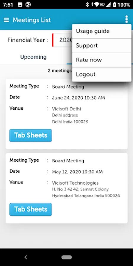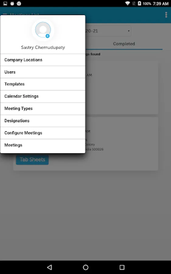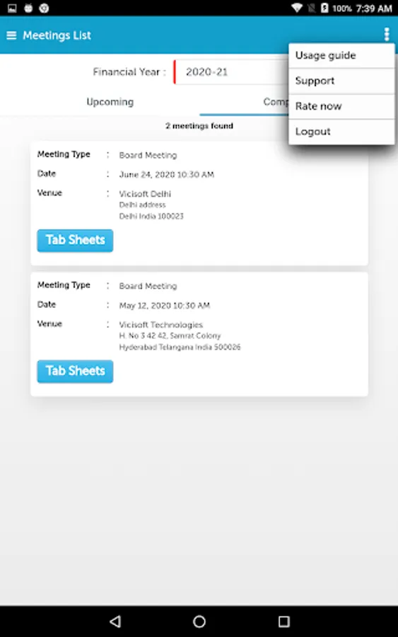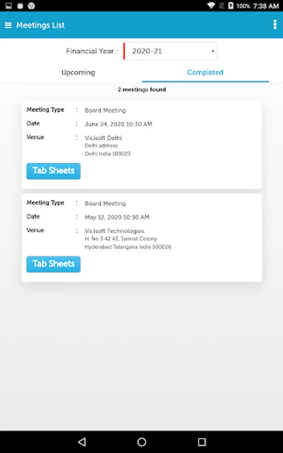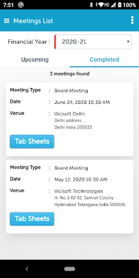 · All the future/upcoming meetings will be displayed under the Upcoming tab and all the completed meetings (whose meeting dates are before today) will be displayed in the Completed tab.