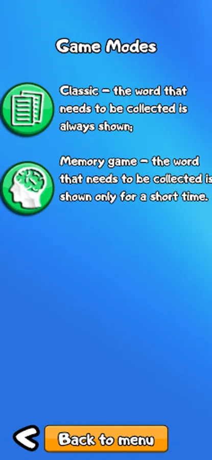 The game has 2 modes - normal and memory game. In the memory game, the word that needs to be collected is shown only for a short time.