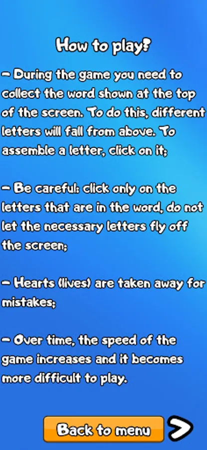 - During the game you need to collect the word shown at the top of the screen. To do this, different letters will fall from above. To assemble a letter, click on it;
