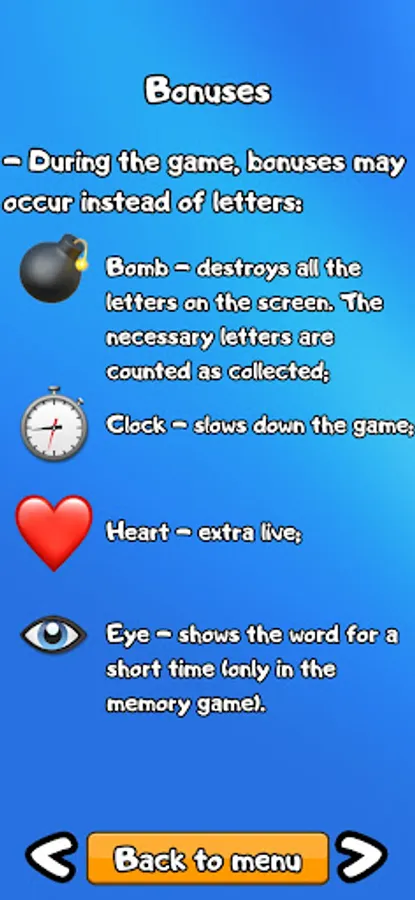 - Bomb - destroys all the letters on the screen. The necessary letters are counted as collected;