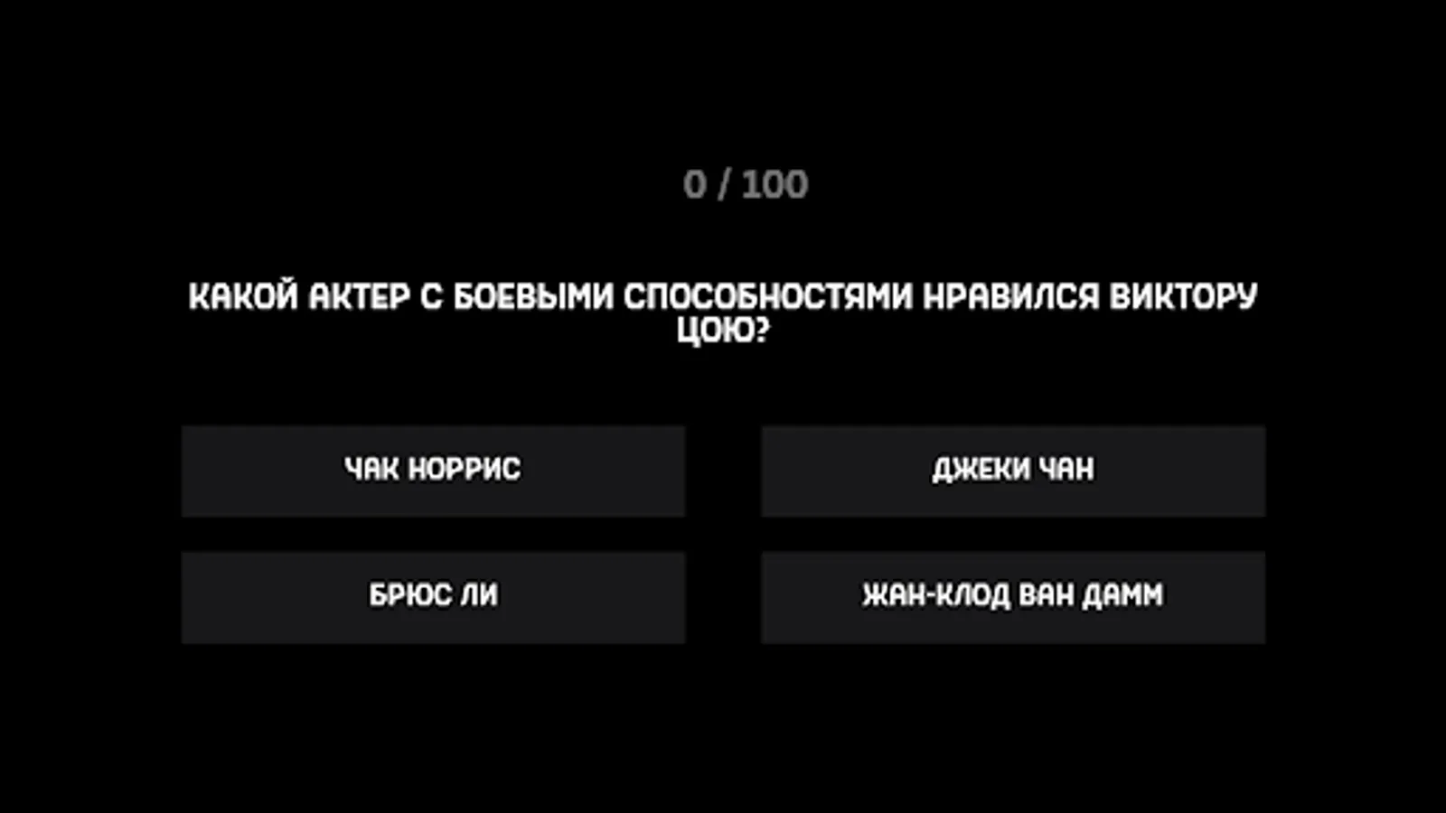 If you are a fan of Viktor Tsoi and the Kino group, then this quiz game is just for you. It contains 100 questions. You need to give the correct answer from the four proposed.