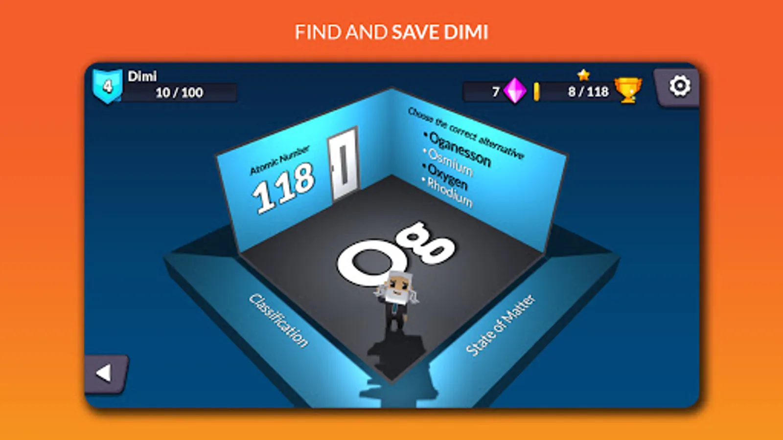The dynamics of the game are as follows: the inventor of the periodic table Dmitri Mendeleev (Dimi) is locked in the room of the last element. You will need to open all the doors, answering the questions correctly, memorizing and learning about the elements in order to reach Dimi and finally, save him.