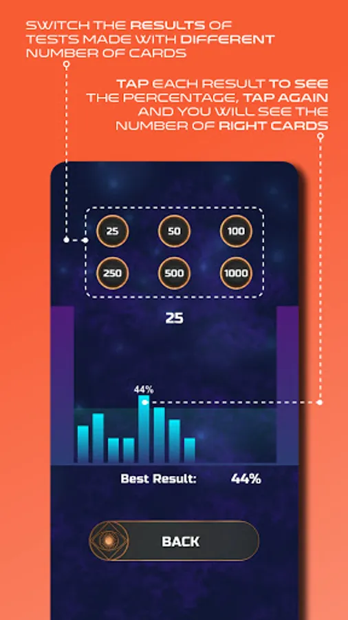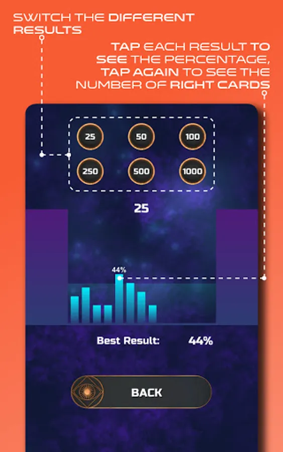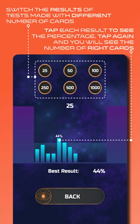 • Choose to use different number of cards, from 25 till 1000, the more cards you use, the more accurate your result will be;