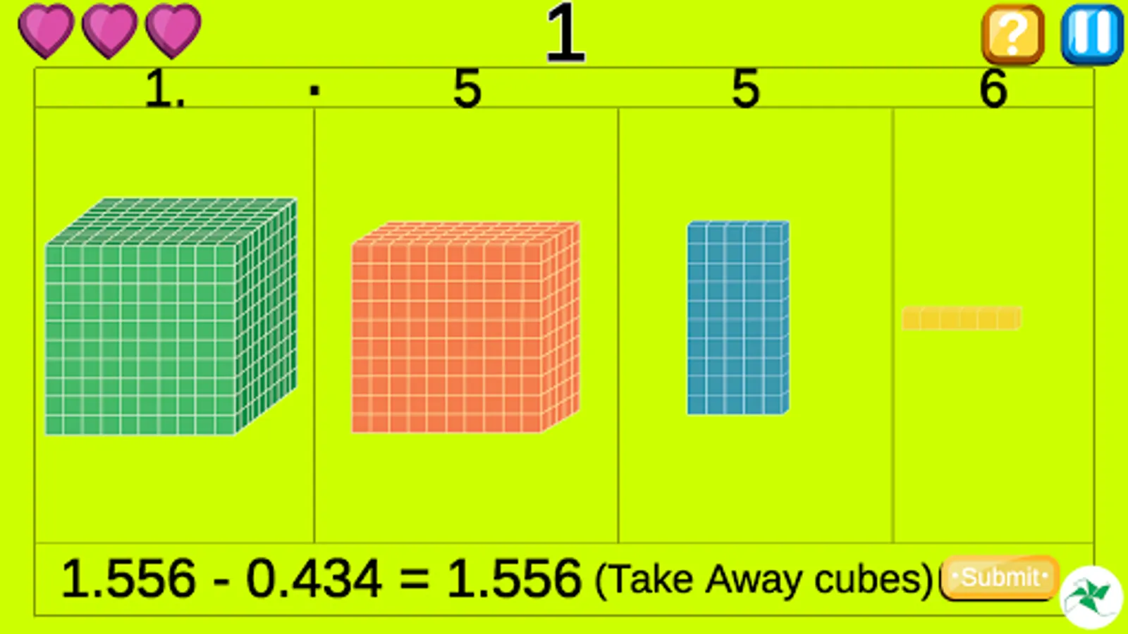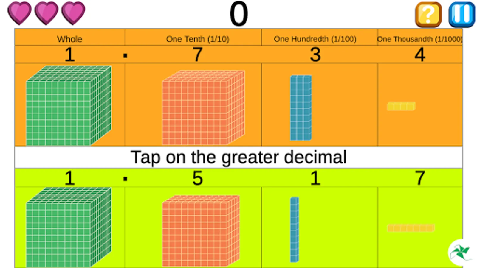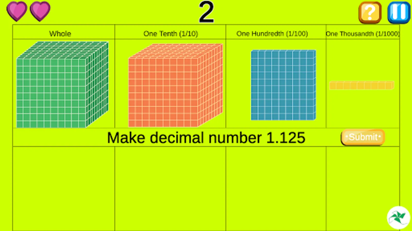 One whole is made of 1000 cubes. This is divided into tenths, hundredths and thousandths parts. Children play with this part to understand relationship between decimals numbers like .2,.02, .002. Gradually children are able to visualize the whole when only part is given.