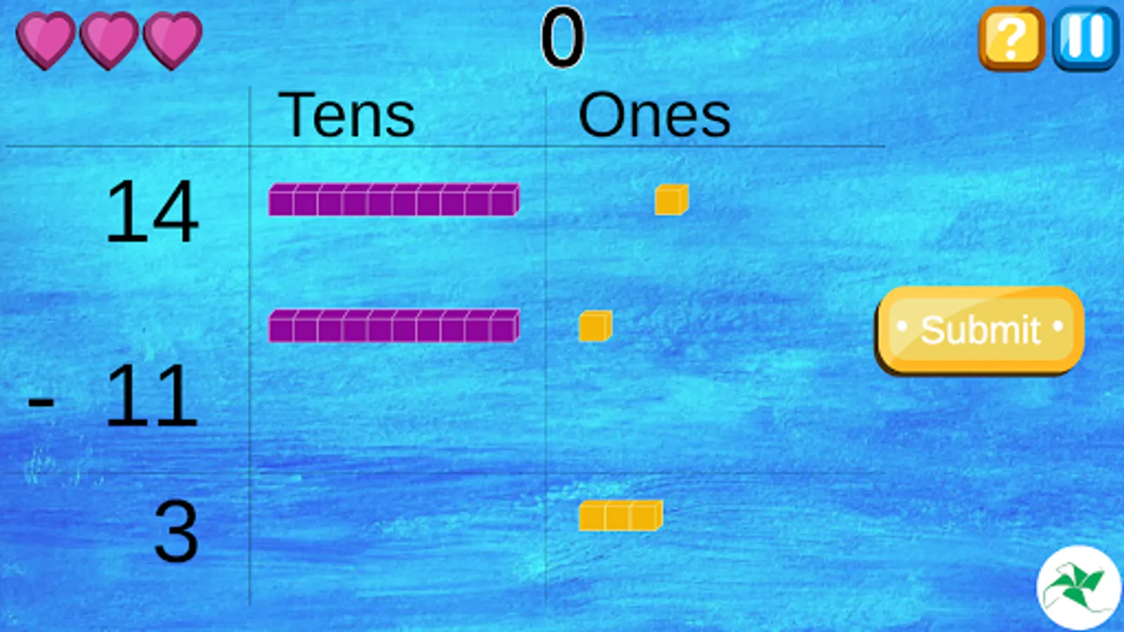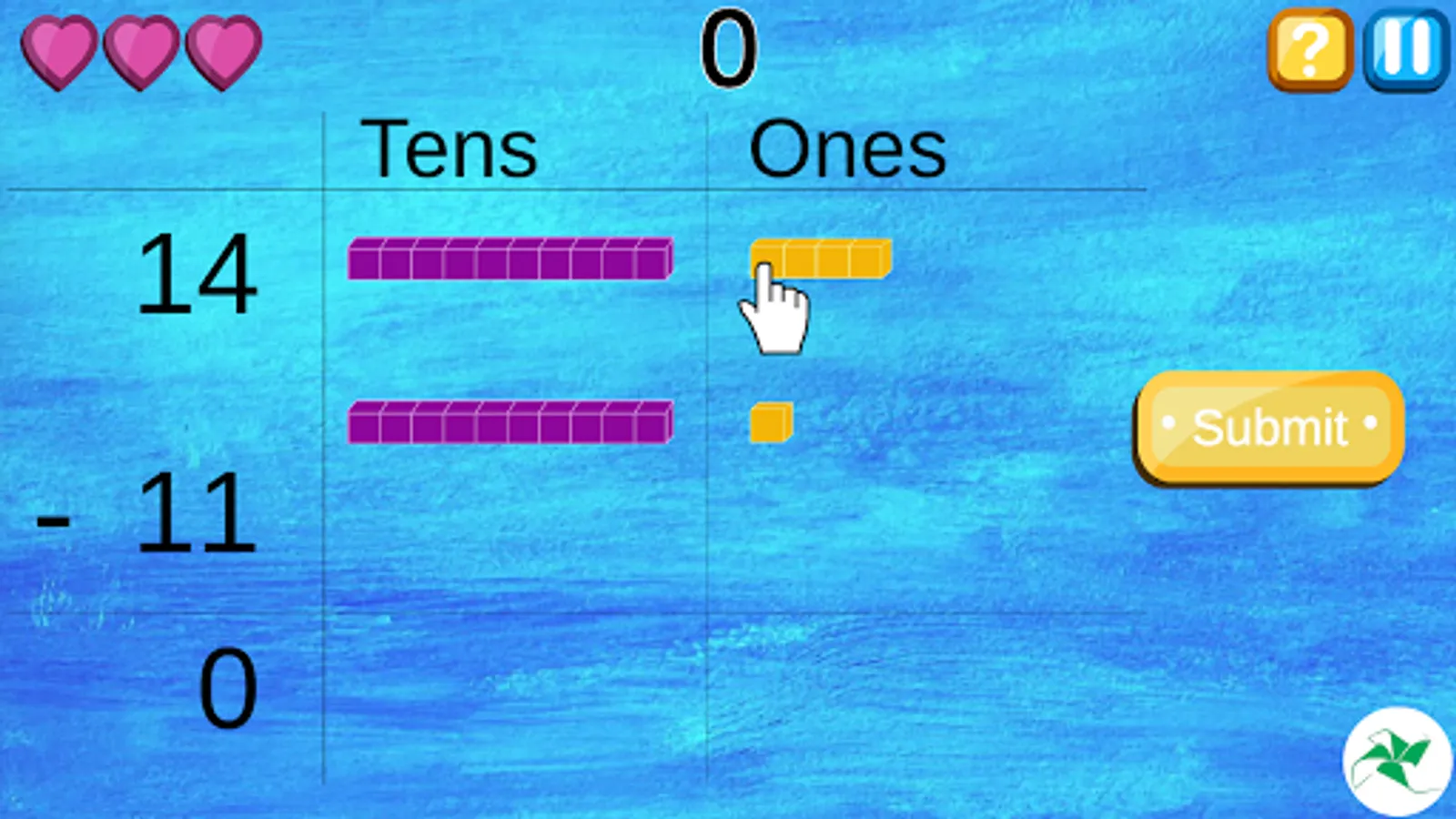 In this game children play and learn subtraction of two-digit numbers which has ONES and TENS. Both ONES and TENS are arranged in two columns. ONES and TENS equal to smaller number is taken away from the bigger number to find the difference or subtract.
