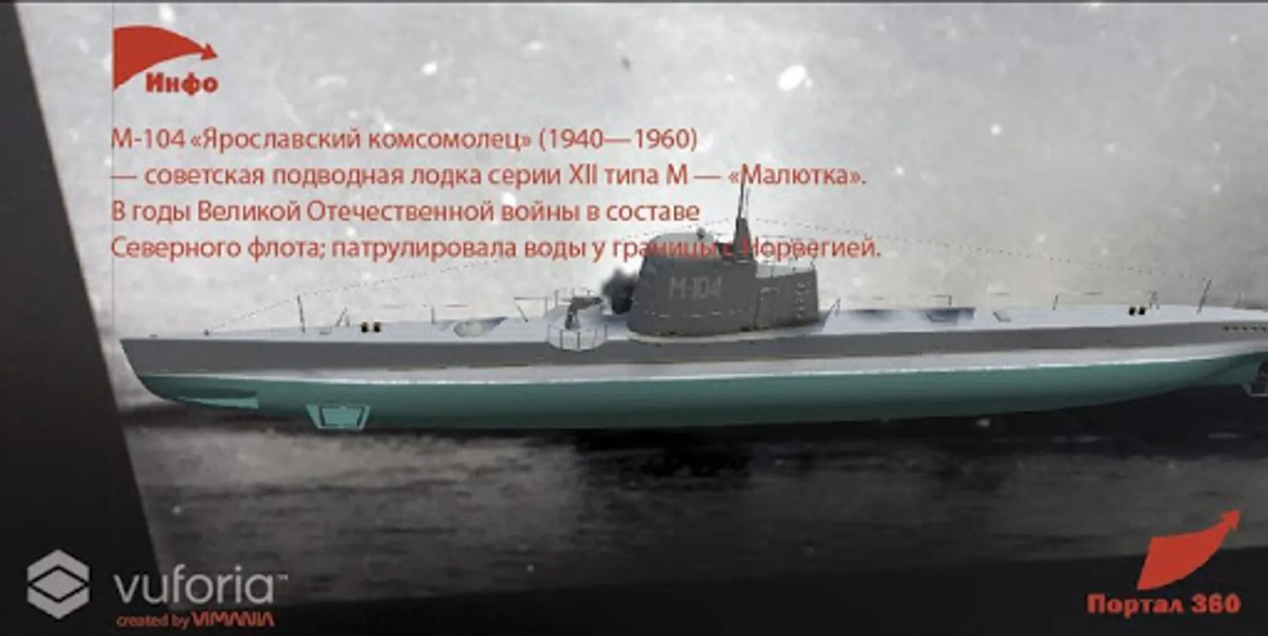 If this technology is available: point the camera of your device to any large horizontal surface (ground surface, paved area, floor of the room, etc.) and click on any point in the center of the device screen. A virtual portal will appear in which you can enter - physically going to the portal. Go inside and walk 1-2 meters - you will find yourself inside the panorama and you can watch the submarine in the natural environment. Turning back you will see the exit from the portal back.