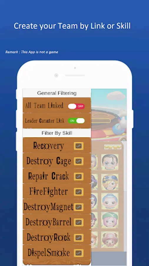 This app can filtering caracters by skills, like desotry barrels, magnets, dispel smoke, repair cracks.