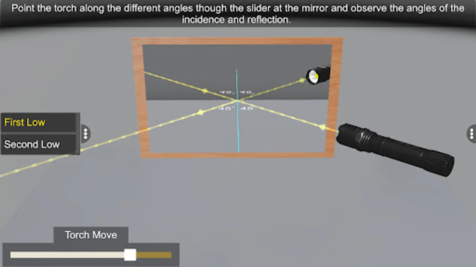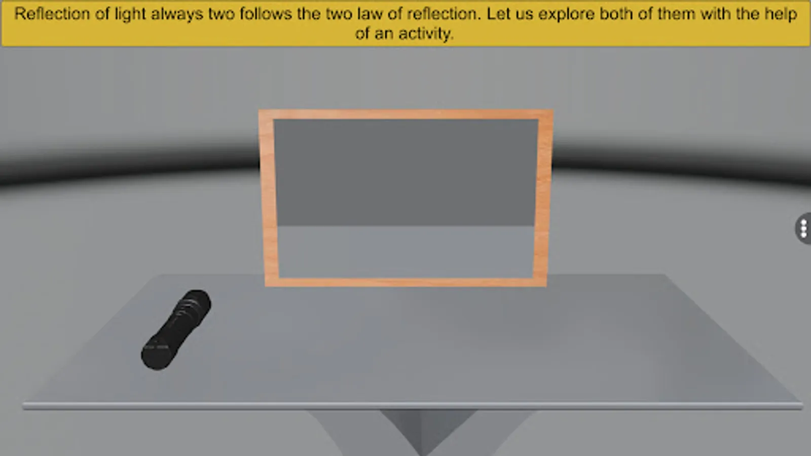 Let us explore the offerings of the “Laws of Reflection” app. The user first gets acquainted with various glassware and apparatus used in the experiment. The user is then guided by the app to perform the experiment with explicit instructions. The experimental procedure is followed by interpretation of the observation and conclusion. This robust application is a great teaching and learning tool for students, educators and teachers wanting to study or teach about the laws of reflection.