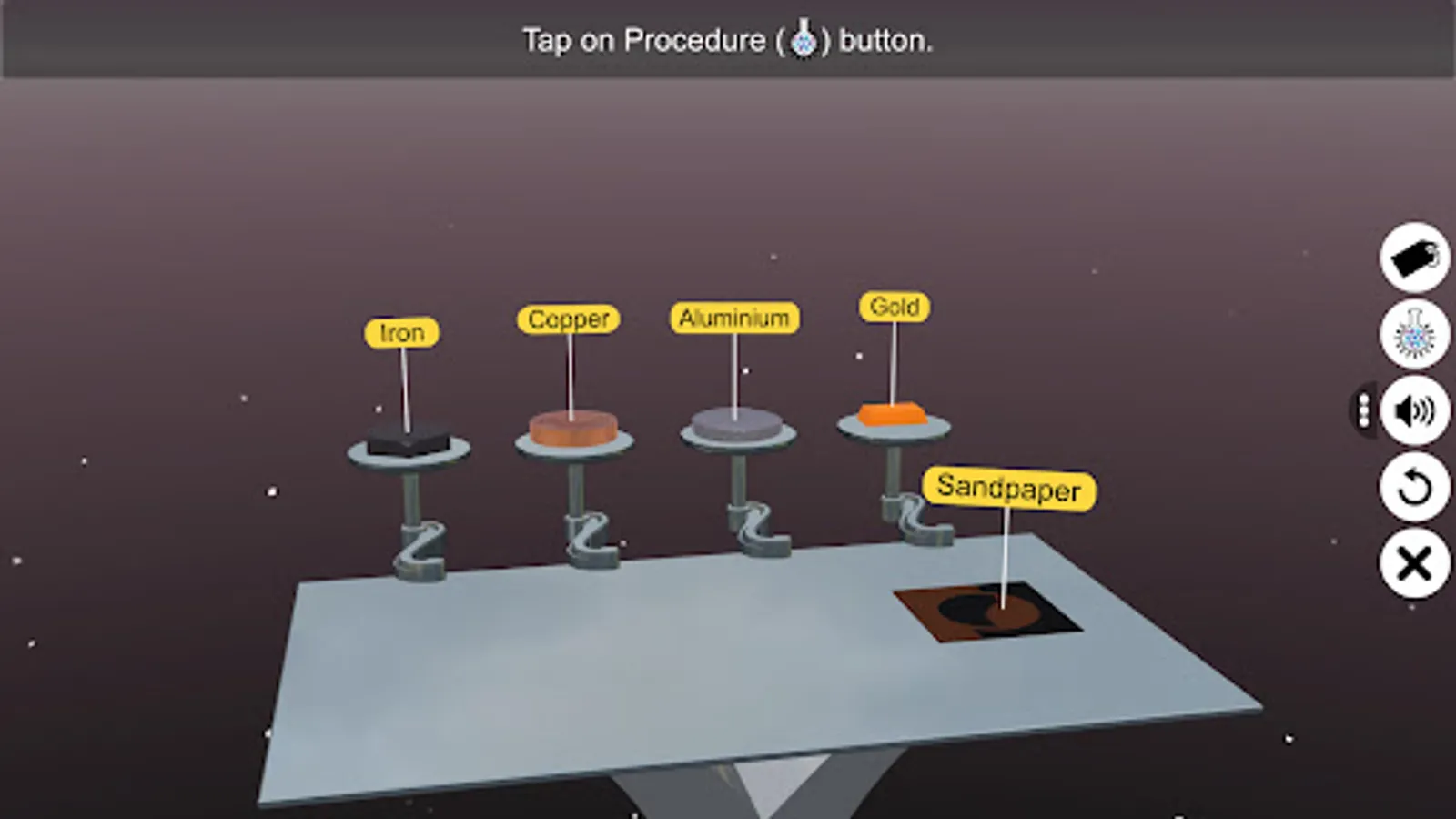 Let us explore the offerings of the “Physical Property - Surface” app. The user first gets acquainted with various glassware and apparatus used in the experiment. The user is then guided by the app to perform the experiment with explicit instructions. The experimental procedure is followed by interpretation of the observation and conclusion. This robust application is a great teaching and learning tool for students, educators and teachers wanting to study or teach about the lustre of metal and nonmetal.