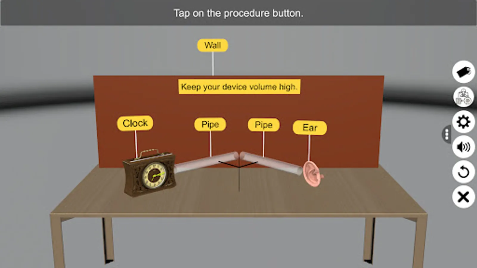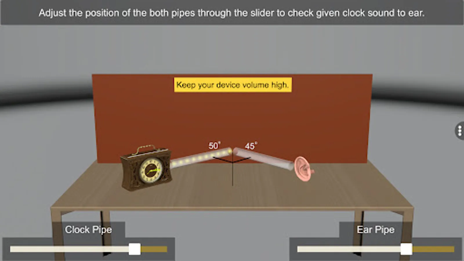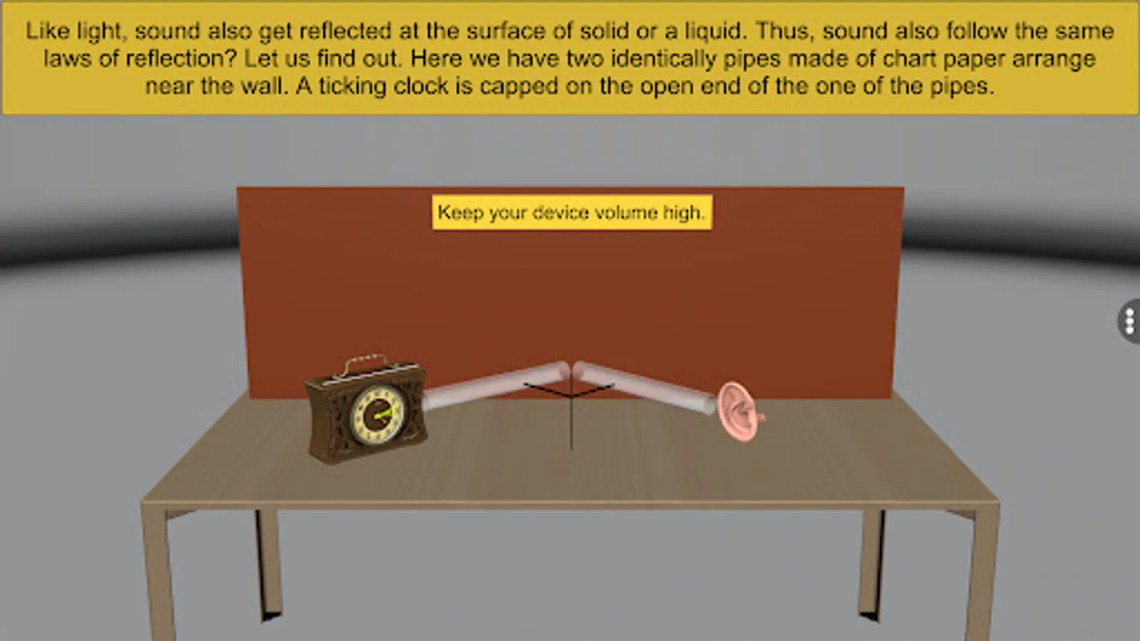 Let us explore the offerings of the “Reflection of Sound” app. The user first gets acquainted with various glassware and apparatus used in the reflection of sound. The user is then guided by the app to perform the activity with explicit instructions. This robust application is a great teaching and learning tool for students, educators and teachers wanting to study or teach about the working of a reflection of sound.