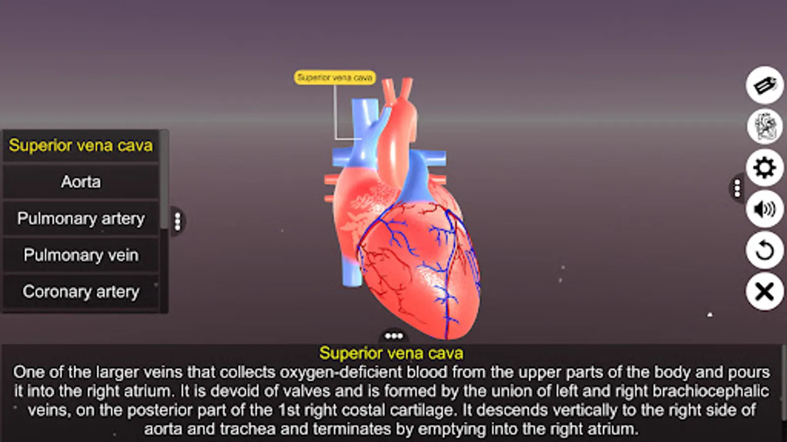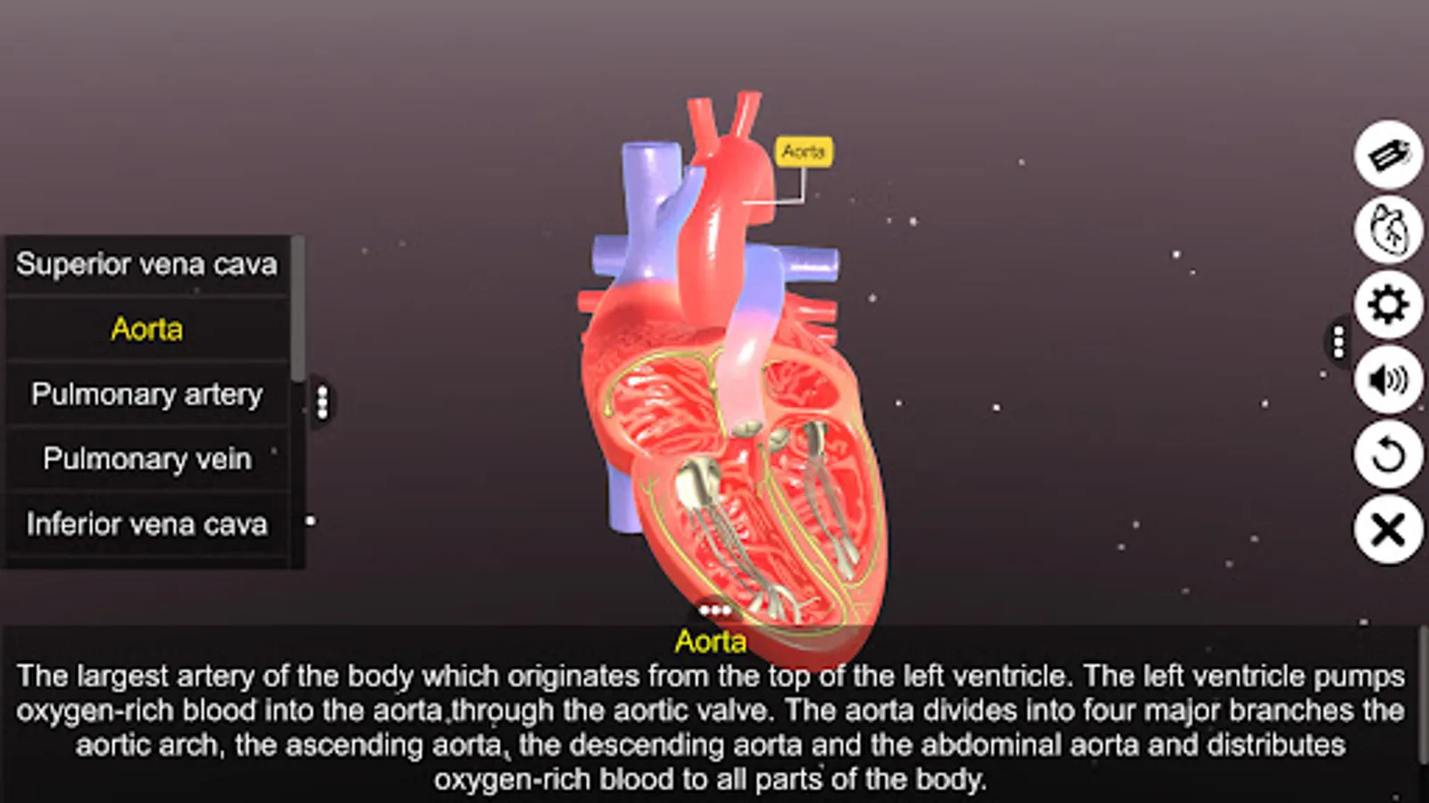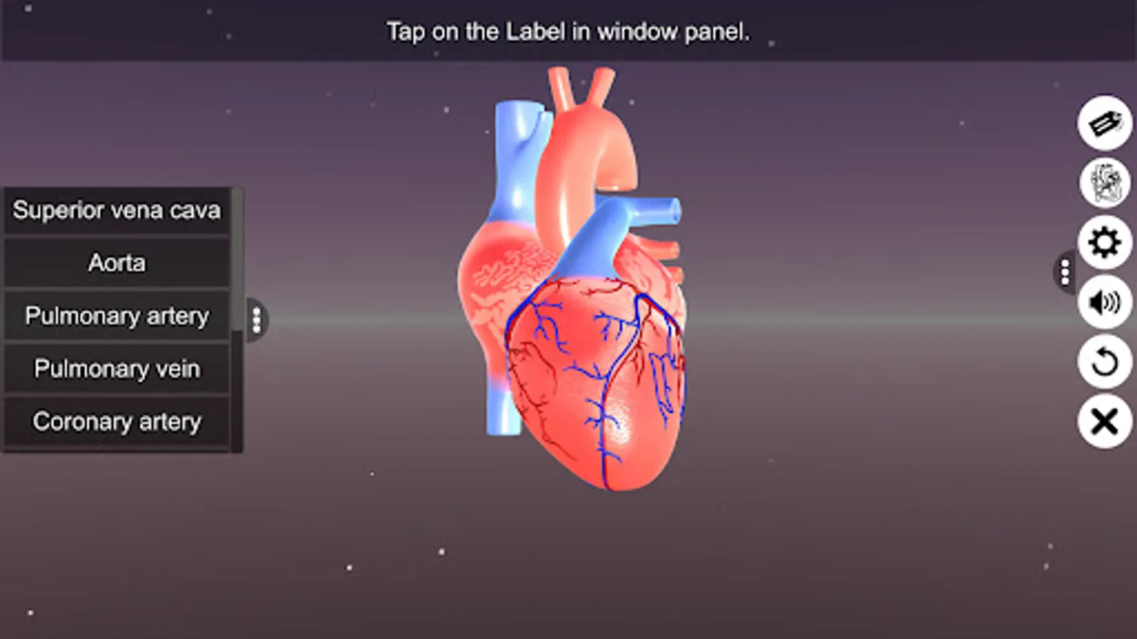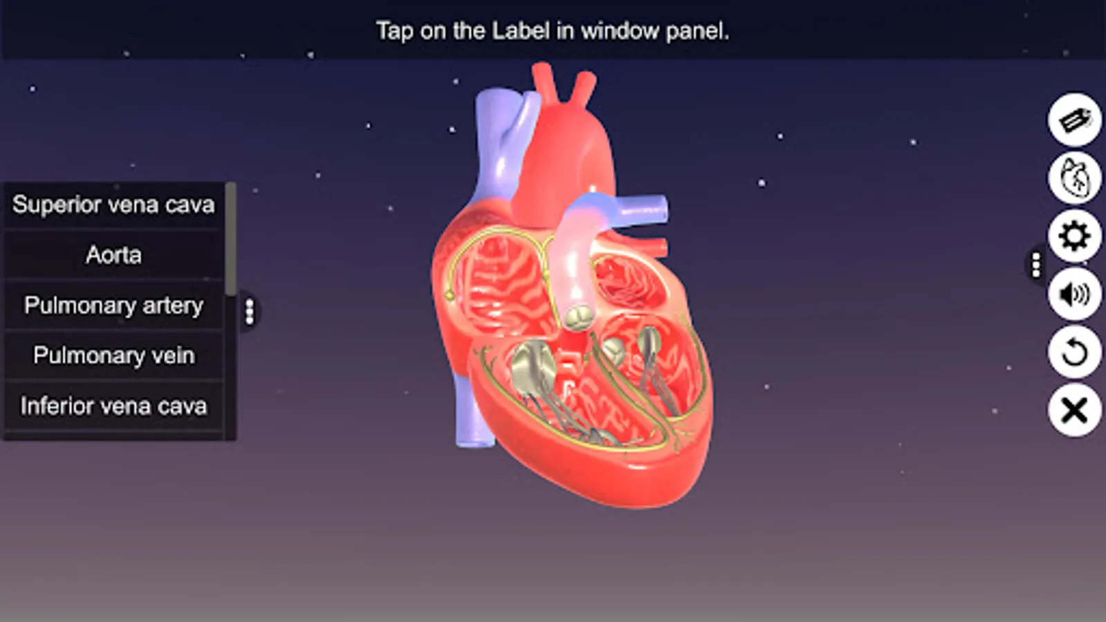 ‘Sections of human heart’ app explains the external and internal structure of human heart through the interactive 3D model to improve the comprehension of the topic. The user can interact with the 3D model by tapping the window labels and getting acquainted with the particular part of the human heart. Tapping the window labels displays the name of the part and also the interactive module is appropriately supported with in depth information about each and every part.