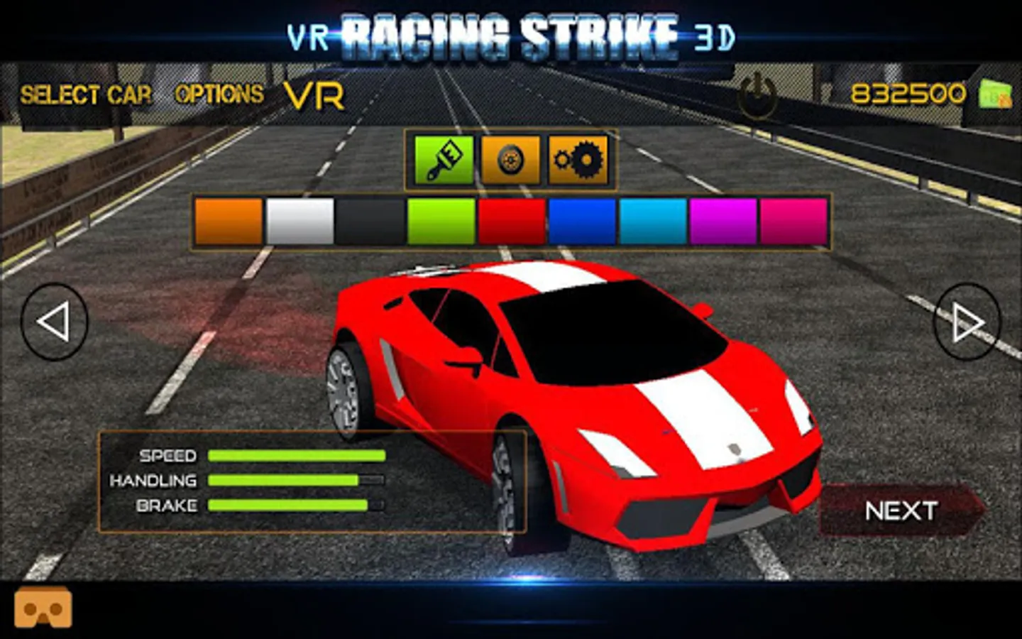 Controlling the car games racing is exactly the same as for devices with a gyroscope and to steel you simply tilt your head left/right. The in game menus, specifically the customization can be a bit more tricky to control without a gyroscope and for this purpose this VR game will start in normal touch mode if you lack a gyroscope. This allows you to customize the car racing games more easily prior to racing in VR and 3D mode. If you do want to use the customization in VR mode please tilt your head left/right to drive the pomeranian sports car racing games.