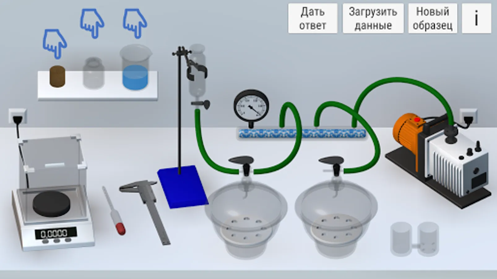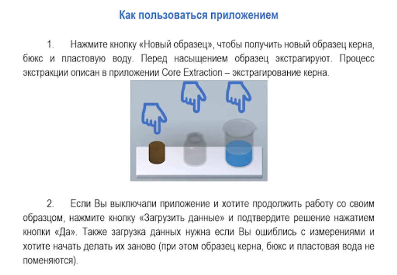The application simulates the installation to saturate core samples with liquid under vacuum. The program has a built-in instructional manual and it is convenient to use it as a visual teaching aid