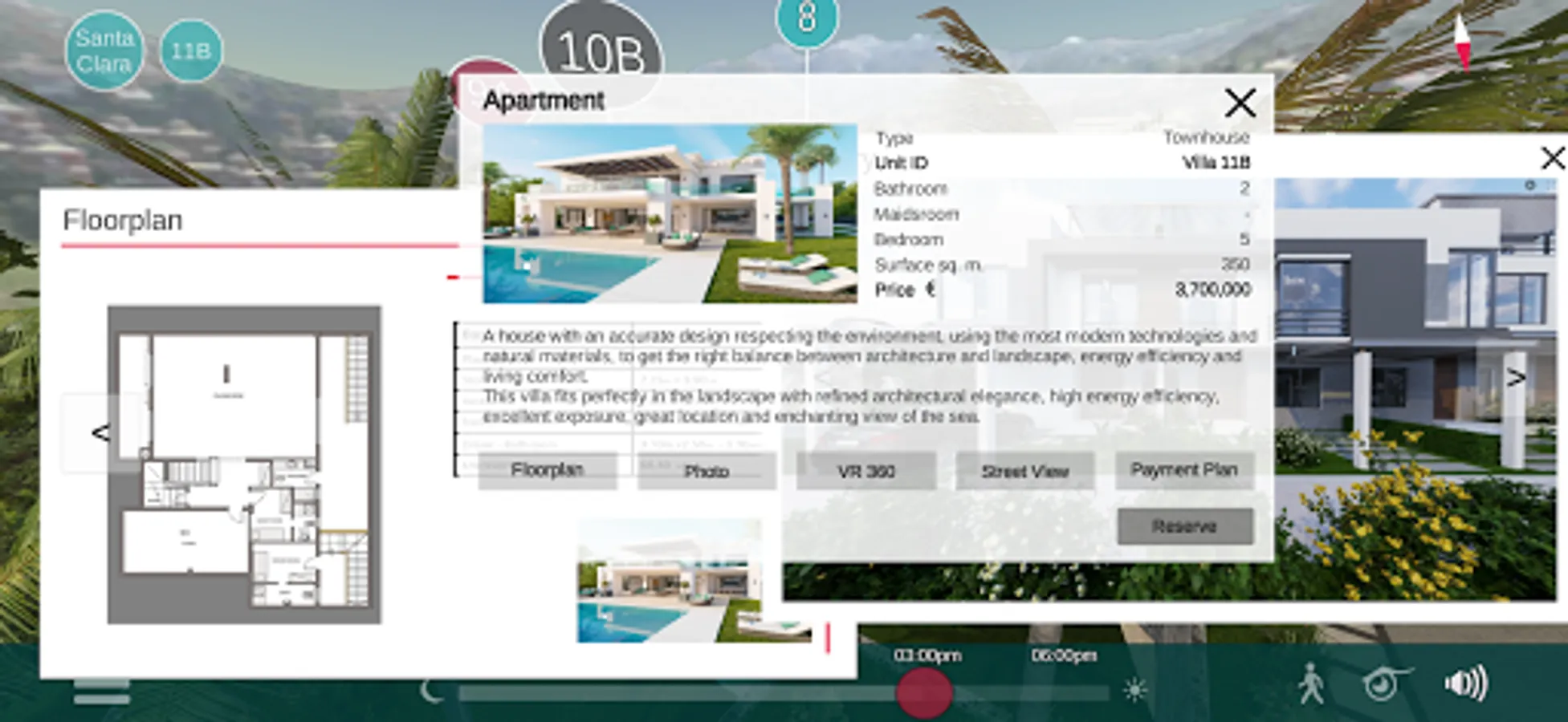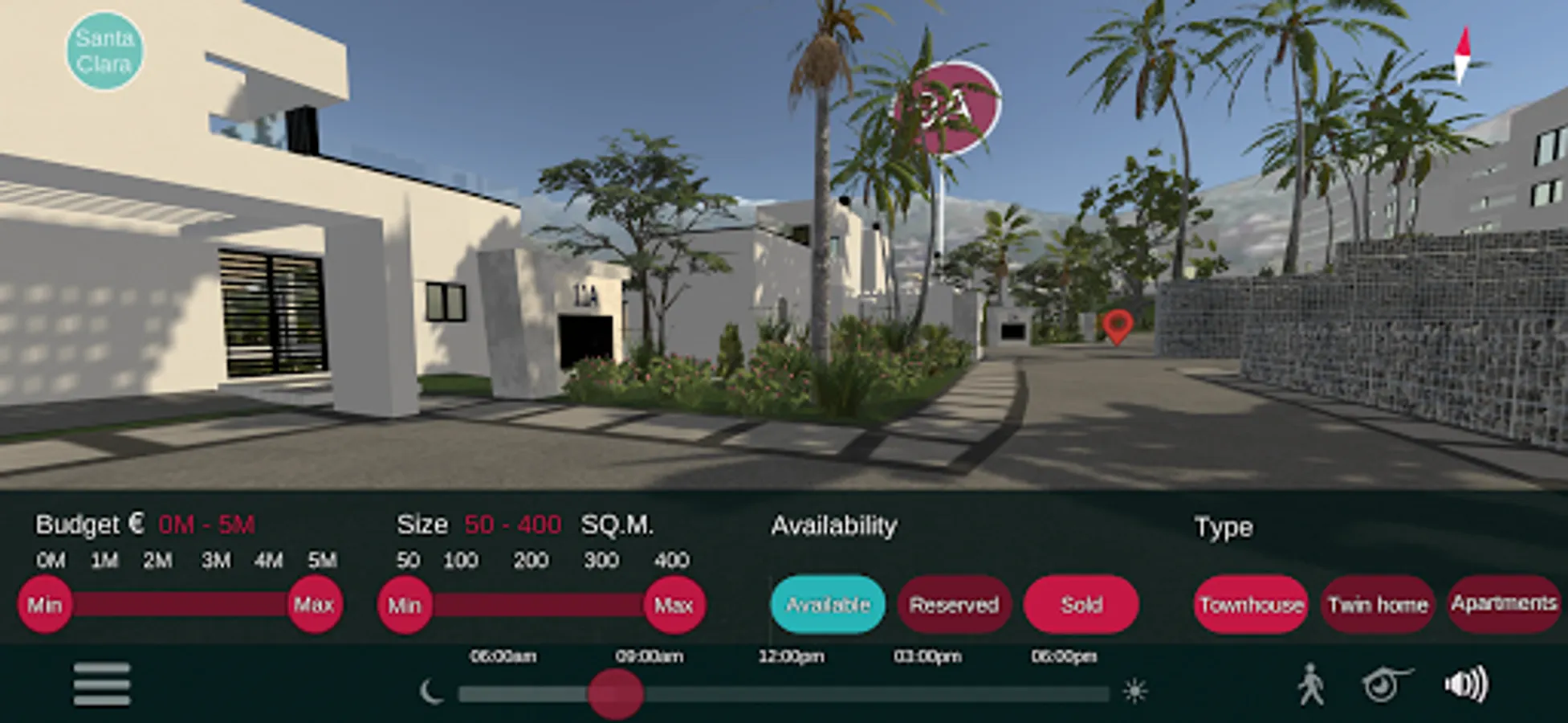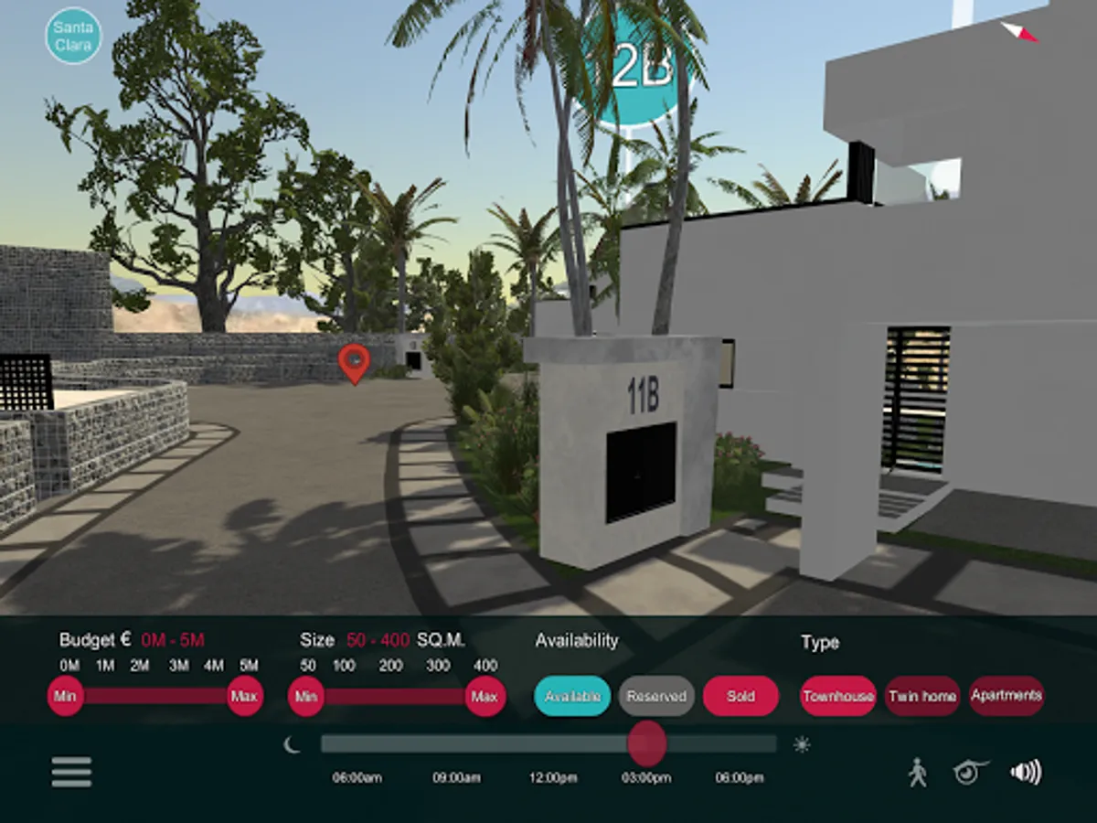 Interactive Masterplan Application allows users to see surroundings from different viewpoints, filter and highlight all unit types by budget, size, available amenities and see general information of each unit, such as gallery, floor plan and price. It is possible to zoom into selected areas of the masterplan, see unit availability information and booking options, and share unit information with customers via email or social media. Street view 360 walkthroughs and photoreal 360 virtual walkthroughs allow to explore the masterplan as well as the outside and inside of any unit.