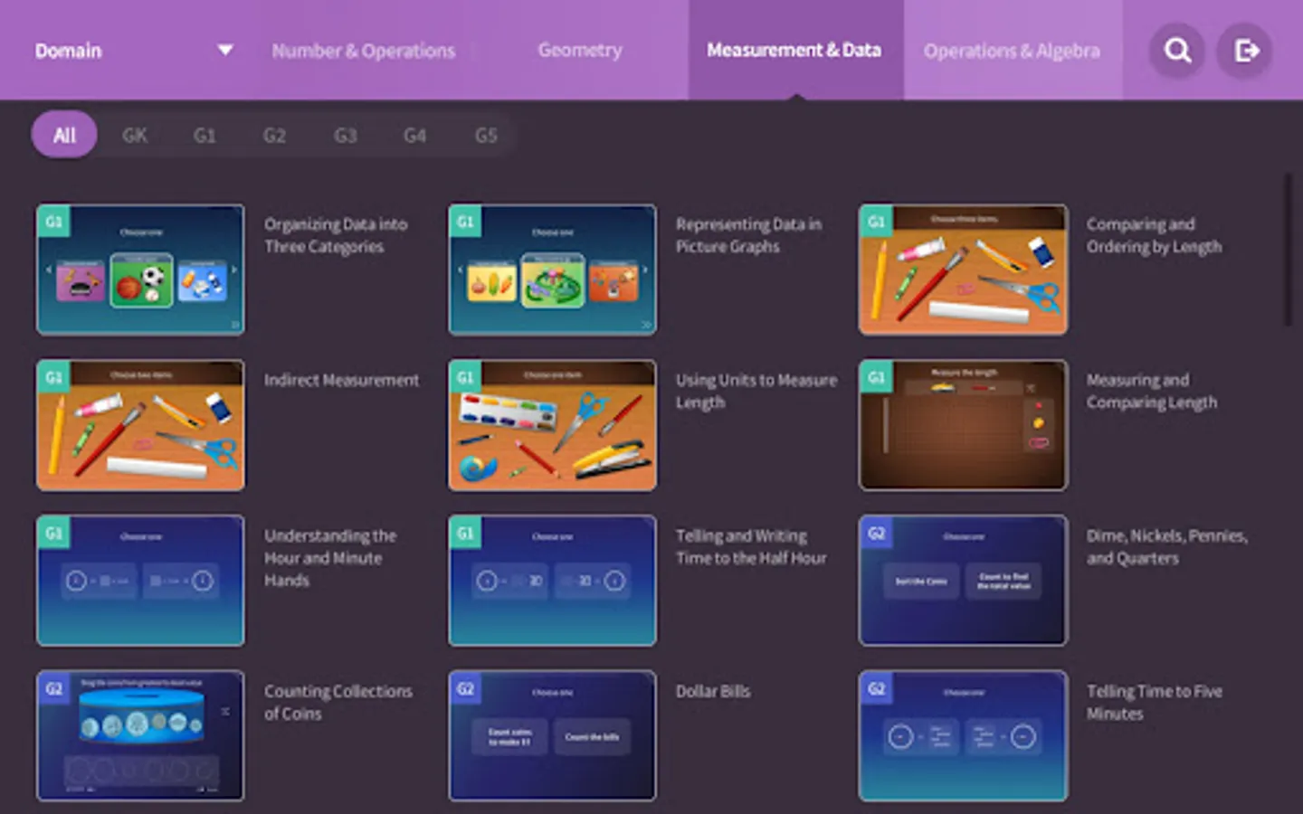 The Concept Tool was developed based on K-5 Common Core State Standards (CCSS). It contains 280 parts over 4 domains—Numbers & Operations (133), Geometry (42), Measurement & Data (52), and Operations & Algebra (53).