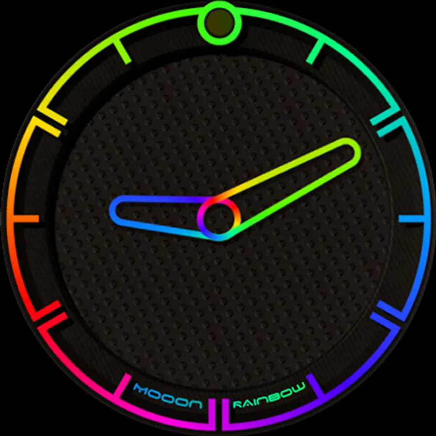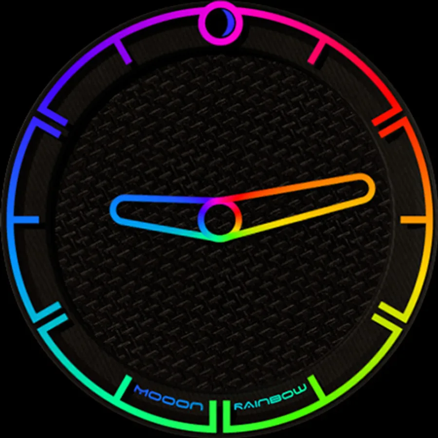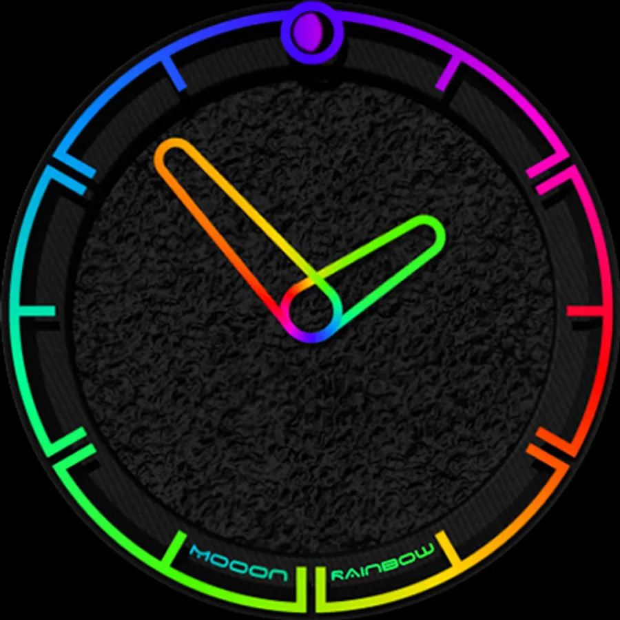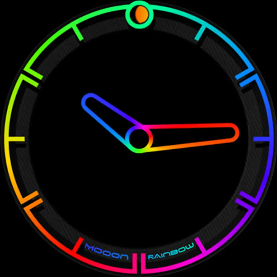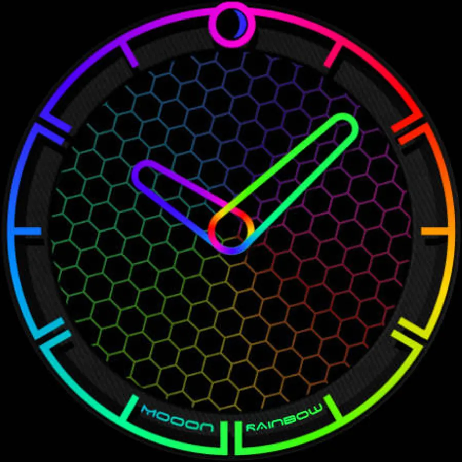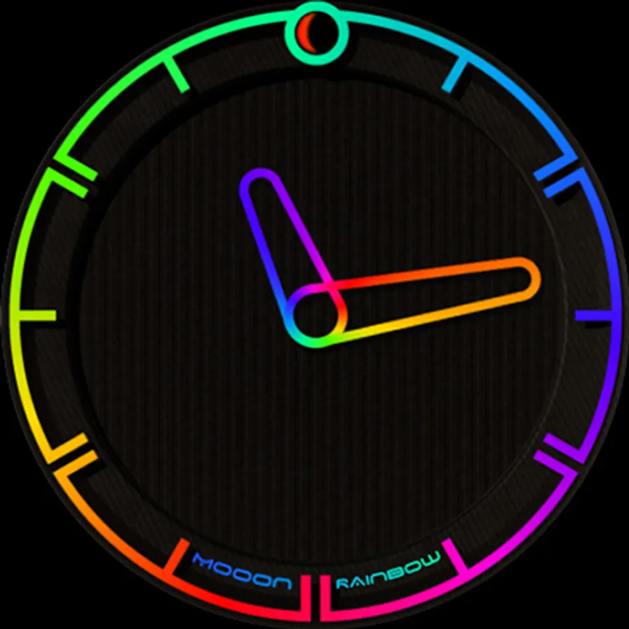A minimalist watch face showing the current time with changing colors of indexes and hands, also displays the current phase of the moon. The dial pattern can be changed for Wear OS.