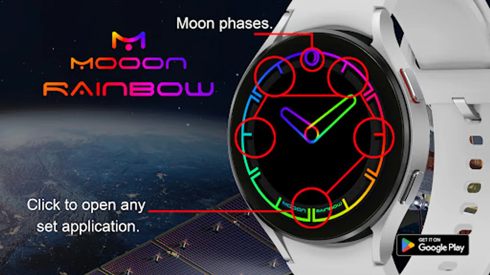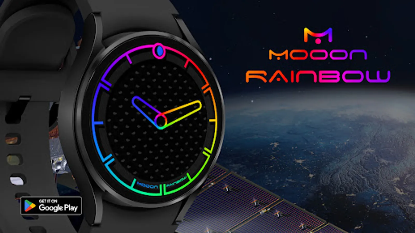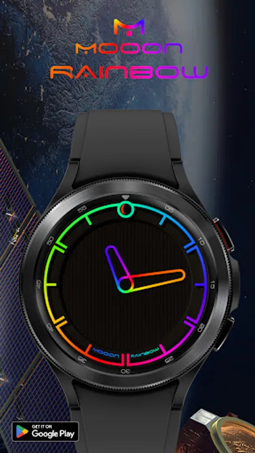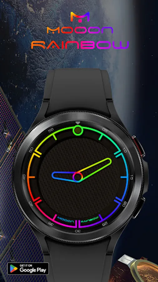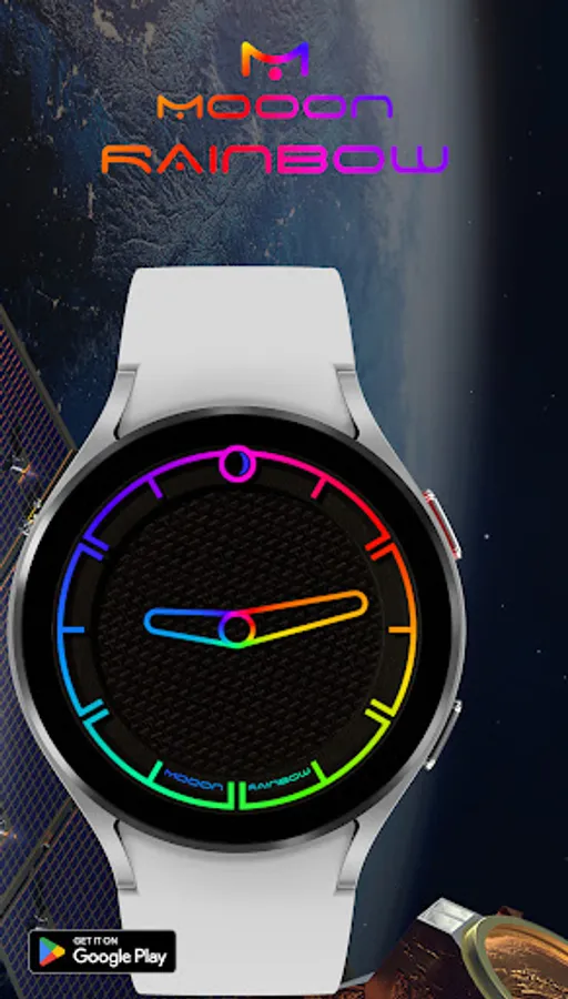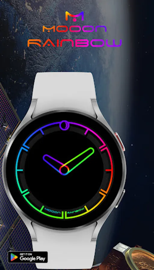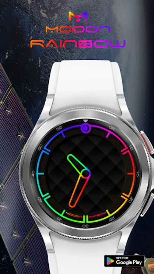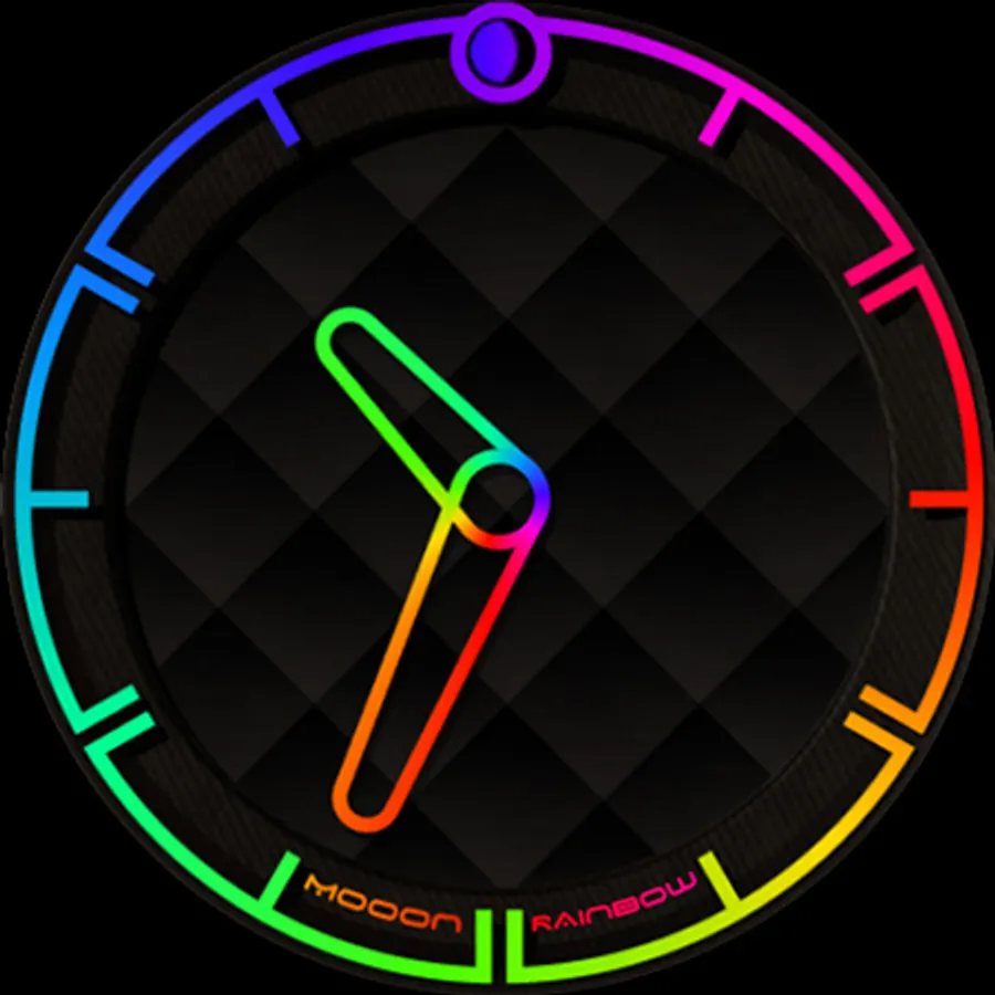 A minimalist watch face showing the current time with changing colors of indexes and hands, also displays the current phase of the moon. The dial pattern can be changed for Wear OS.