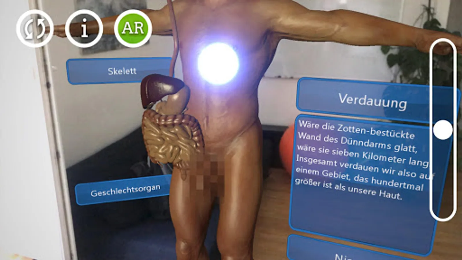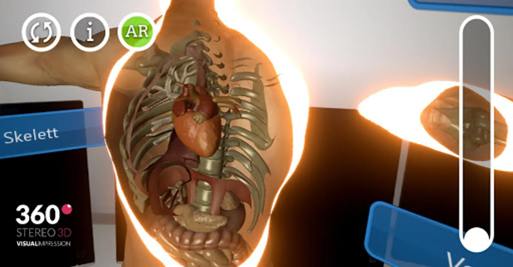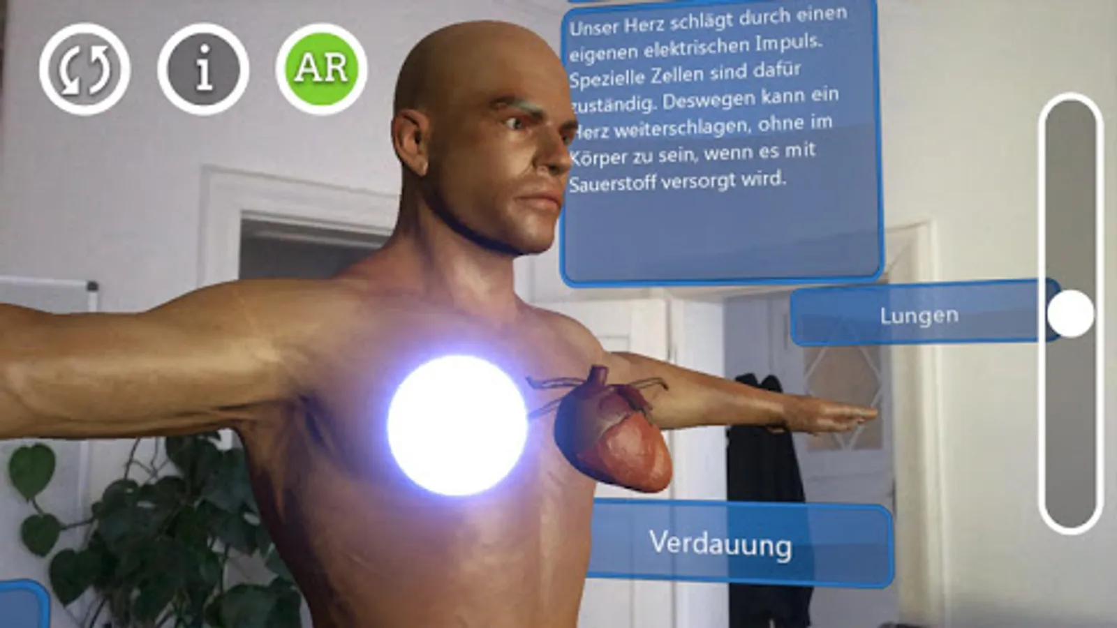 ARBody is an Augmented Reality app and makes it possible to just looked real environment text information in an anatomical 3D model of the human body to blend. With your phone camera you can see the real environment and simultaneously in real time (live) the 3D model. In our app you can touch the text, to meet near the person, the different organs and parts of the body and understand through. By you to move yourself on the body, the skin fades out and you can explore the human inner life in a whole new way. After the touch on a block of text, e.g. "Heart" disappear all body parts when approaching, except for the heart. Now you can look at each organ and see exactly where it is in the body is at rest. In addition, you will receive interesting information about each organ. You can also place it on a desk and change the size with the slider located laterally to the body.