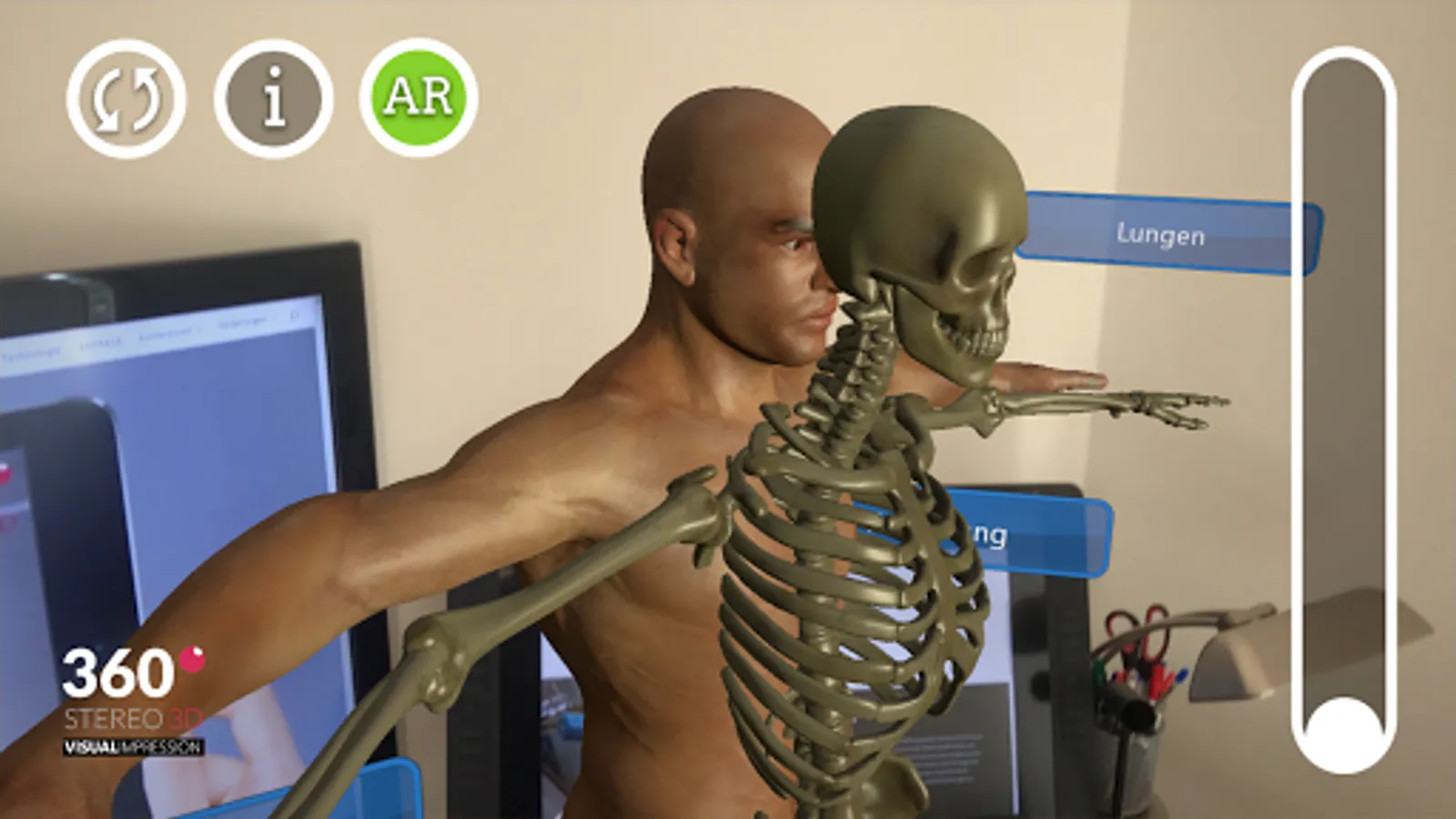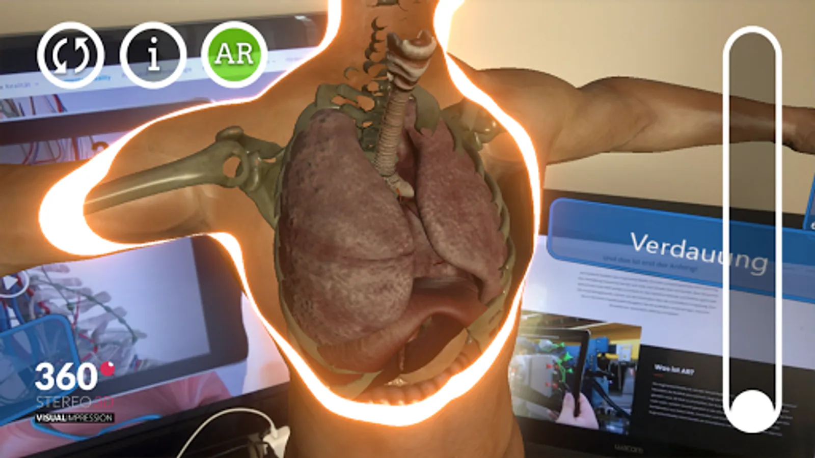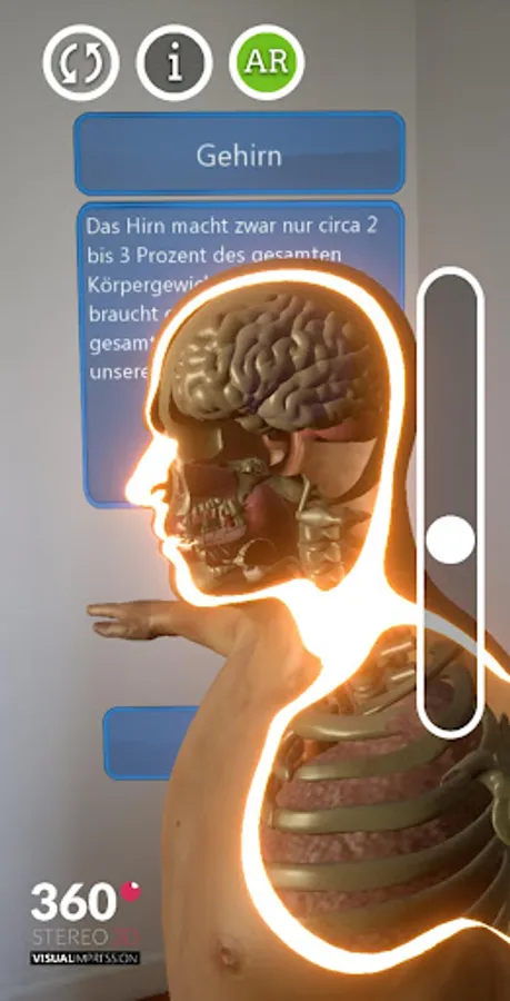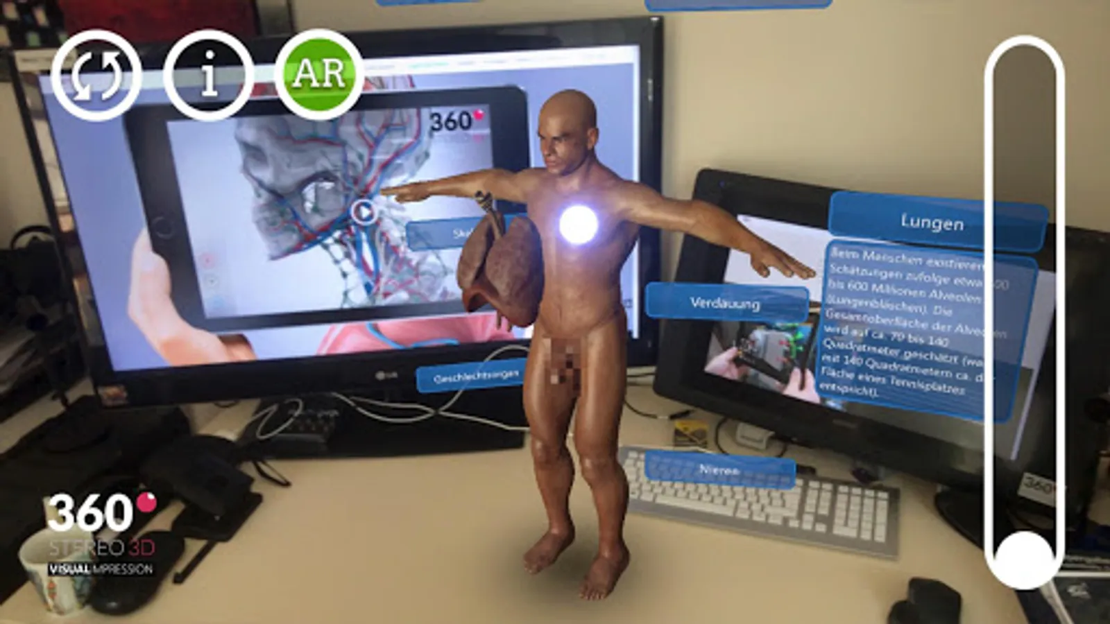 ARBody is an Augmented Reality app and makes it possible to just looked real environment text information in an anatomical 3D model of the human body to blend. With your phone camera you can see the real environment and simultaneously in real time (live) the 3D model. In our app you can touch the text, to meet near the person, the different organs and parts of the body and understand through. By you to move yourself on the body, the skin fades out and you can explore the human inner life in a whole new way. After the touch on a block of text, e.g. "Heart" disappear all body parts when approaching, except for the heart. Now you can look at each organ and see exactly where it is in the body is at rest. In addition, you will receive interesting information about each organ. You can also place it on a desk and change the size with the slider located laterally to the body.