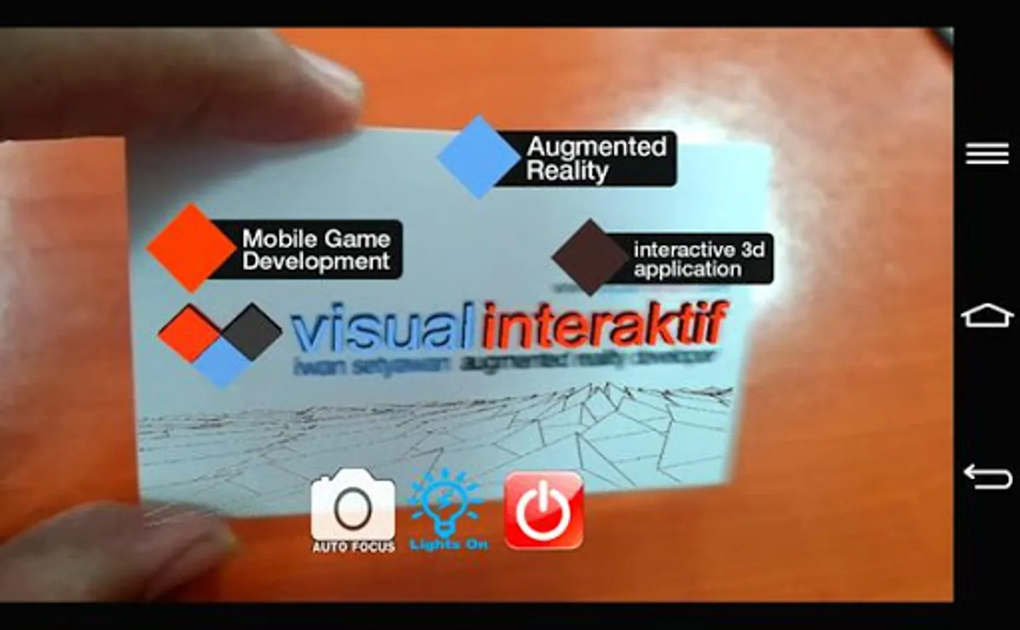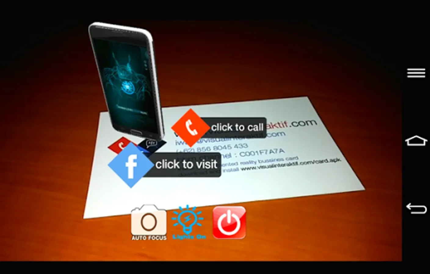 This is augmented reality card for visualinteraktif.com, download cards in www.visualinteraktif.com/card.pdf then print business cards, run the app and point the camera to the card that you print.