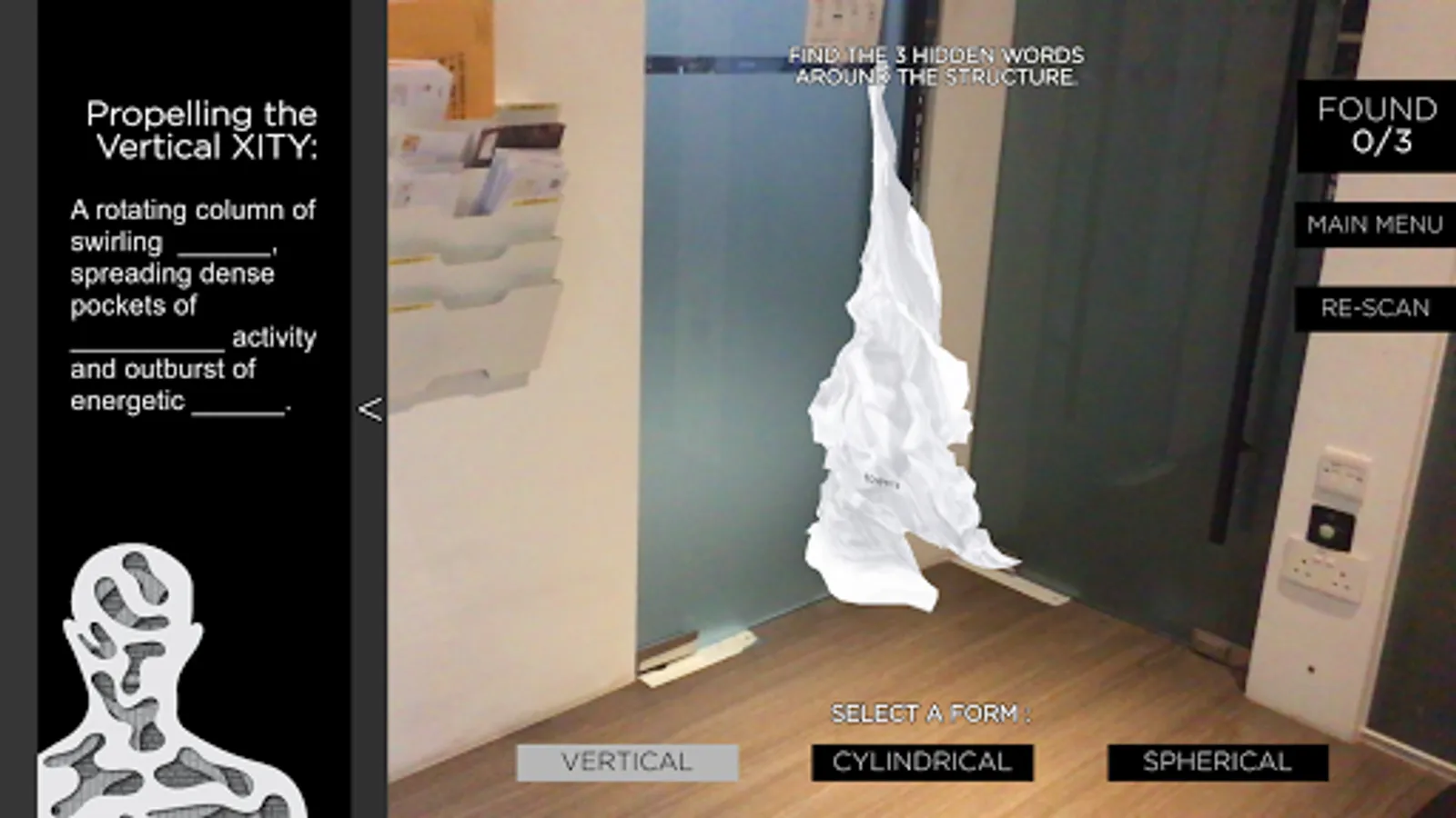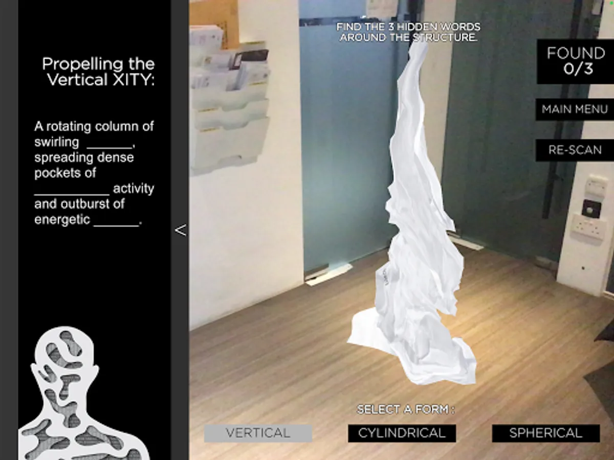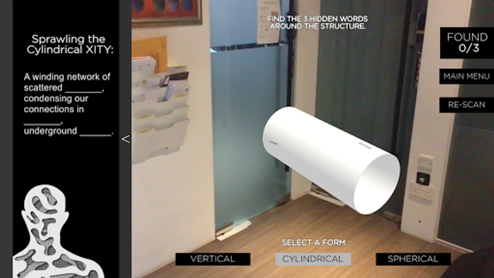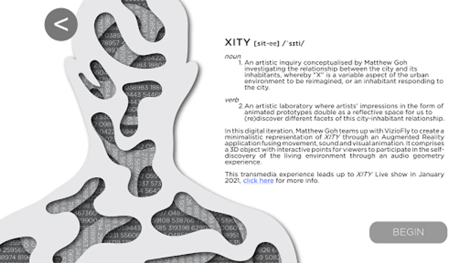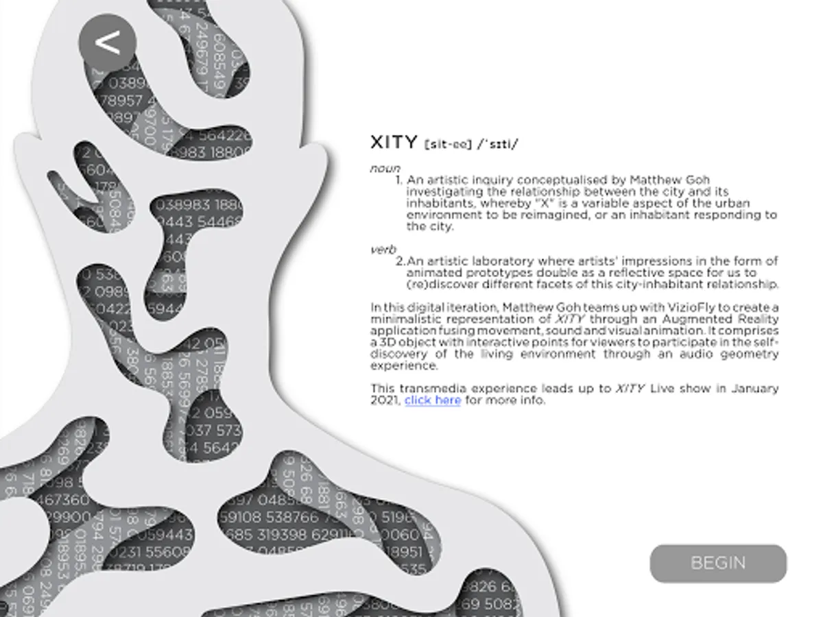 In this digital iteration, Matthew Goh teams up with VizioFly to create a minimalistic representation of XITY through an Augmented Reality application fusing movement, sound and visual animation. It comprises a 3D object with interactive points for viewers to participate in the self-discovery of the living environment through an audio geometry experience.