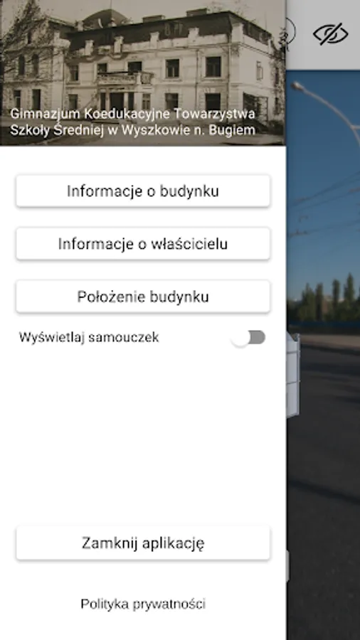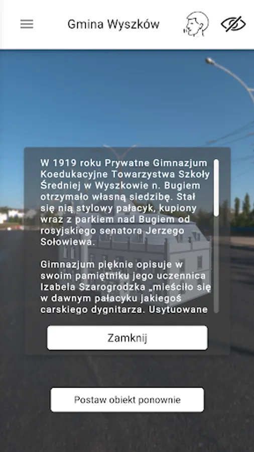 The application allows you to display in augmented reality a model of the currently non-existent building of the Coeducational Middle School of the Secondary School Society in Wyszków on the Bug River. It also contains interesting information about the school itself.