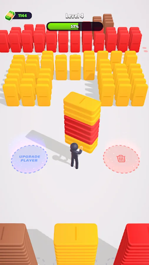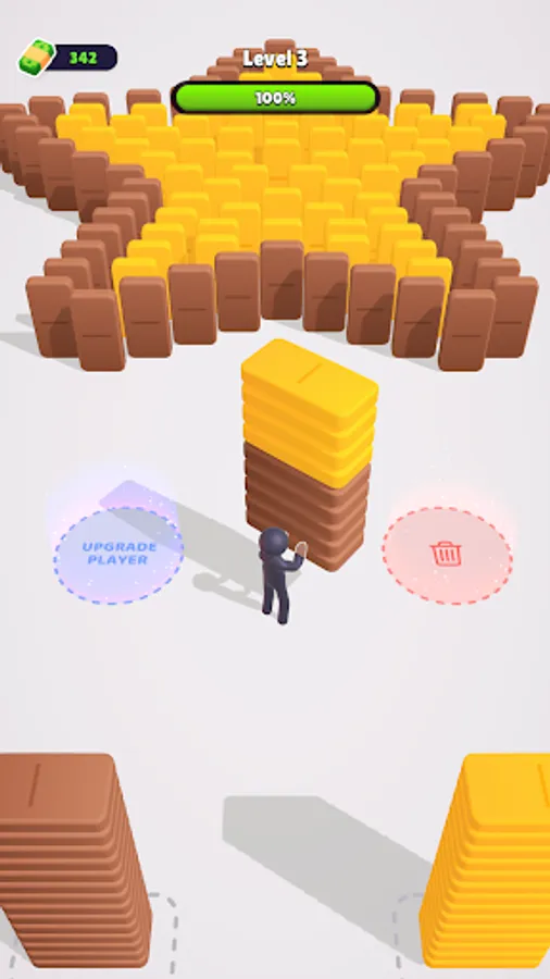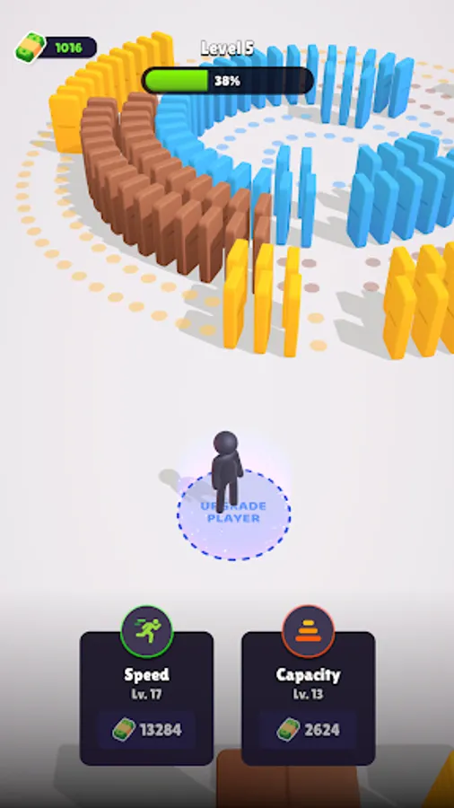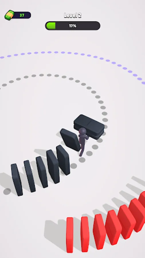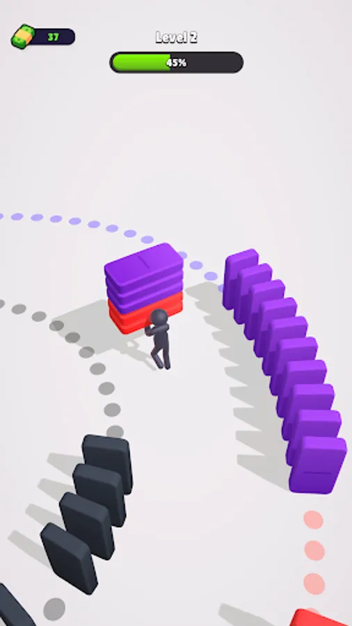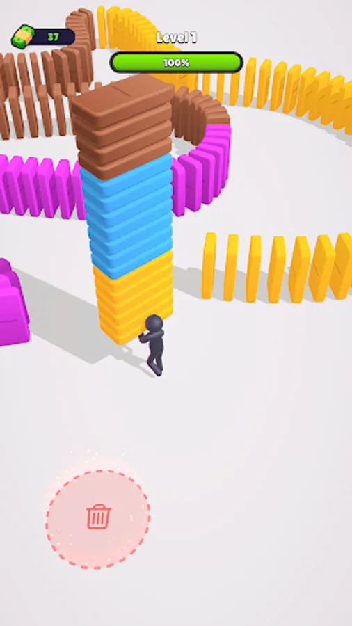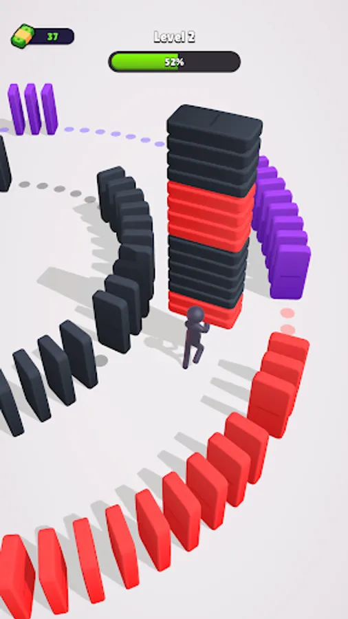 Stack the domino tiles and go to the placing area to place them on the relevant slots to complete the shape. Remember that as soon as you touch them, they fall! The more domino tiles fall the more money you earn and the more you upgrade your stack capacity and speed.