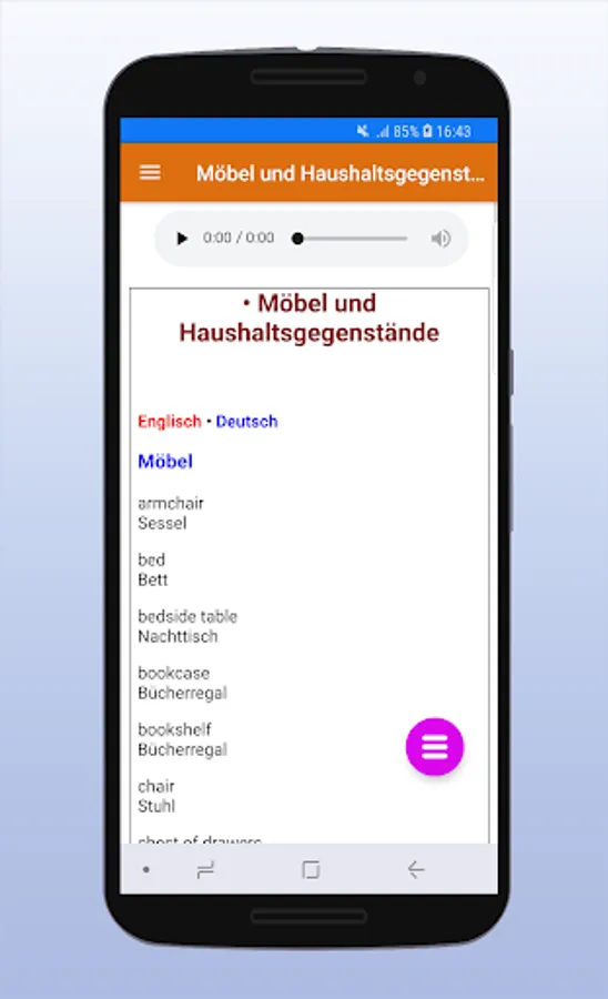 the most important words and phrases of the situation together; Starting from the German, the learner should speak the German translation himself.
