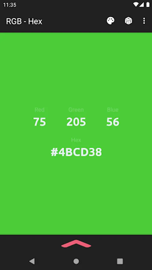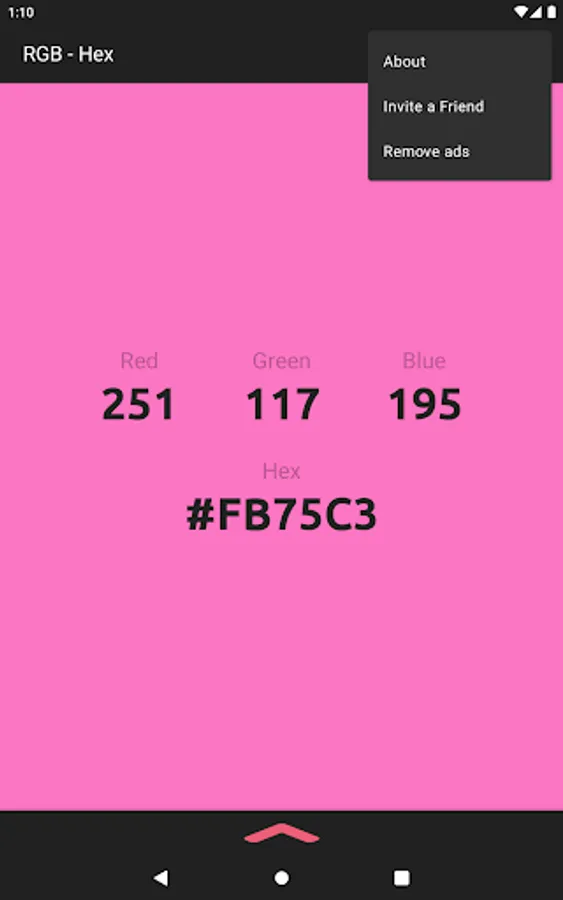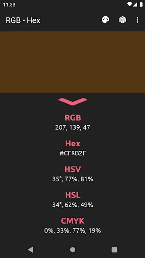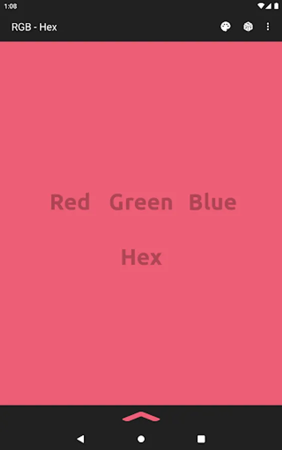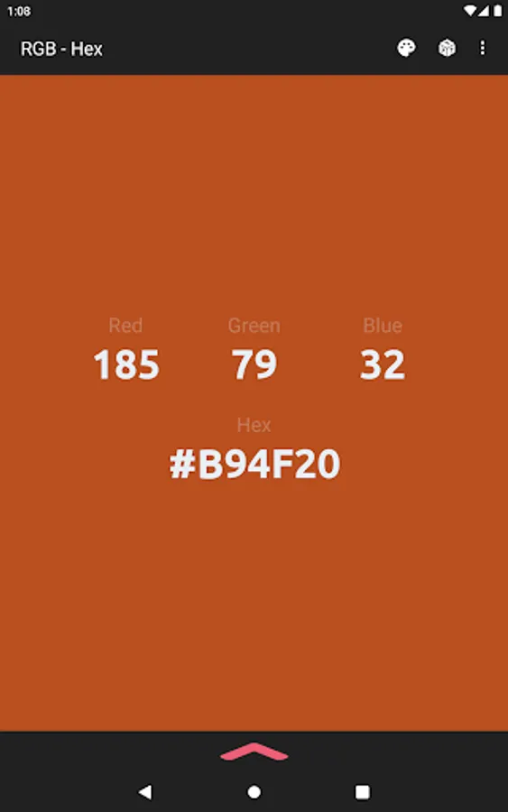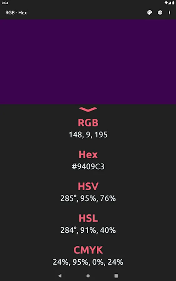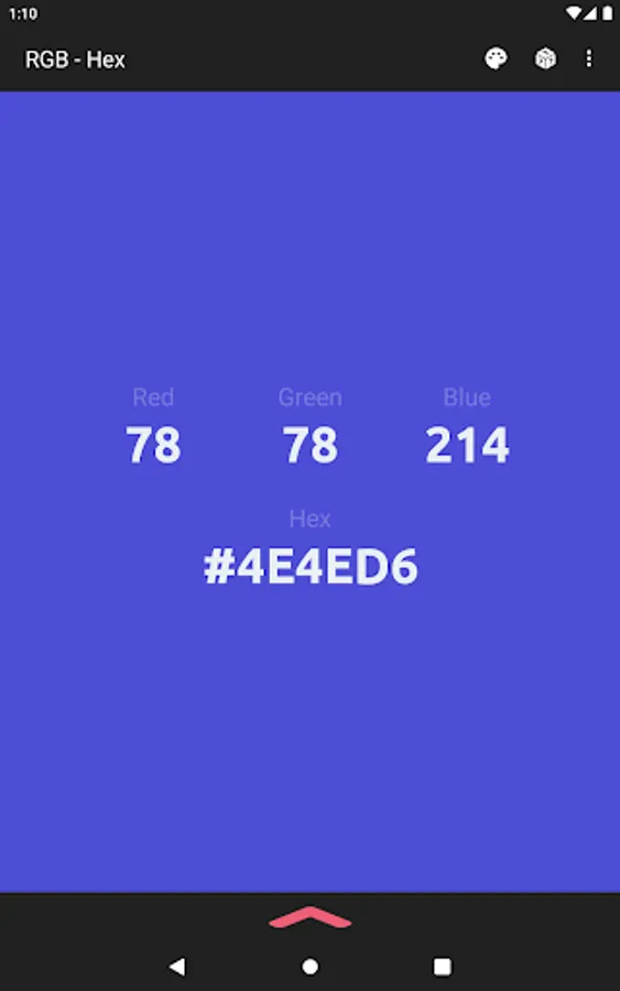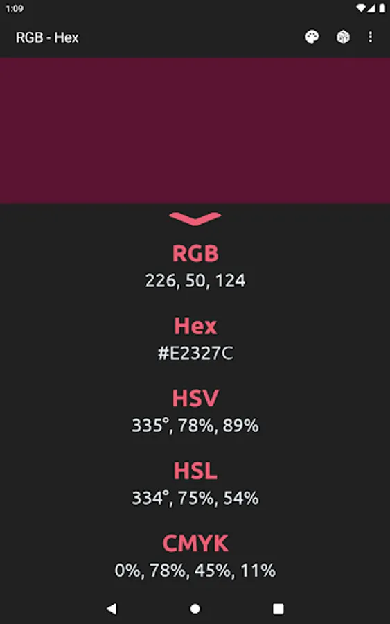 The app also acts as a color converter between RGB and Hex values. It will also show the converted values in HSV, HSL, and CMYK!