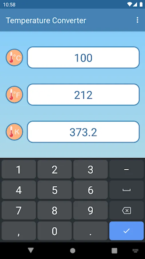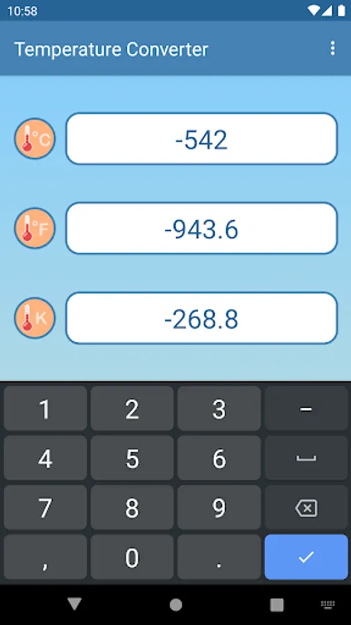 You can simply enter any value for the preferred temperature and the app will instantly convert the other two temperatures. Temperature Converter is easy to use with clear user interface.