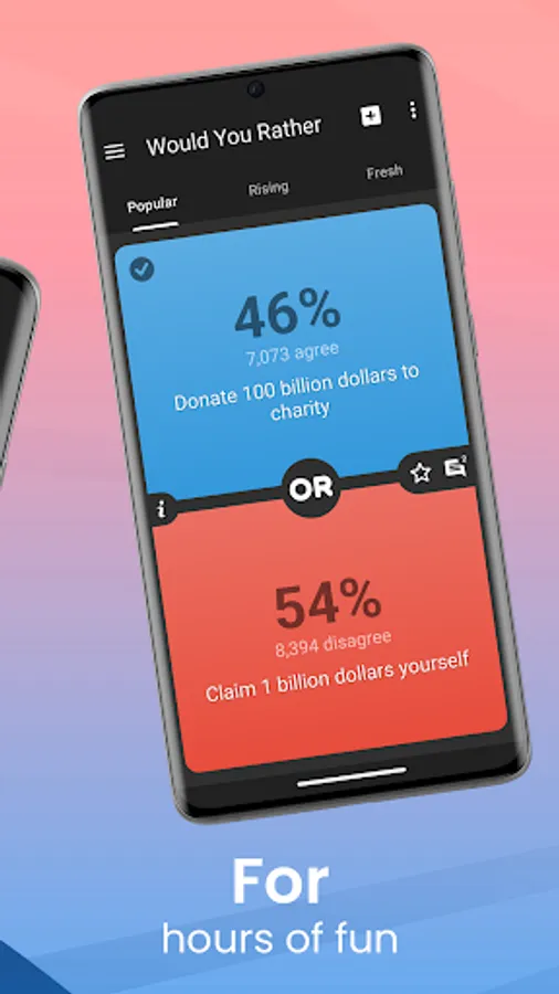 With thousands of fun, unusual, unique, crazy, and funny questions, this WYR game guarantees days of non-stop entertainment. It's based on the popular conversation and party game that presents dilemmas in the form of "Would you rather" or "this or that" questions. Explore intriguing options like having the power of flight or invisibility, choosing between money and fame, or even tackling challenging scenarios. With such a vast collection of questions, boredom doesn't stand a chance!