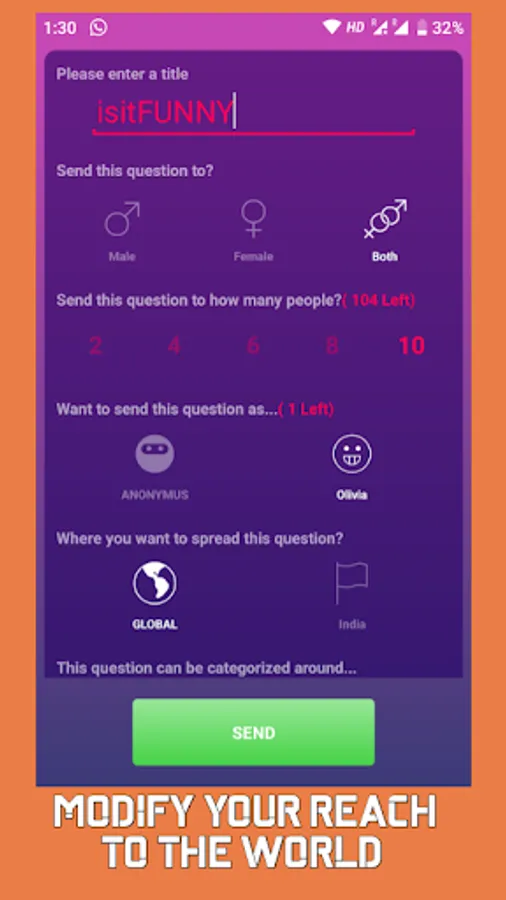 Vosa gives you the power to ask a question to any certain number of randomly selected other users. You can always select to how many users you want your question to reach and also if you want to target a certain sex you easily can.