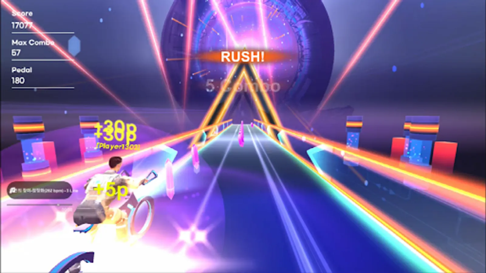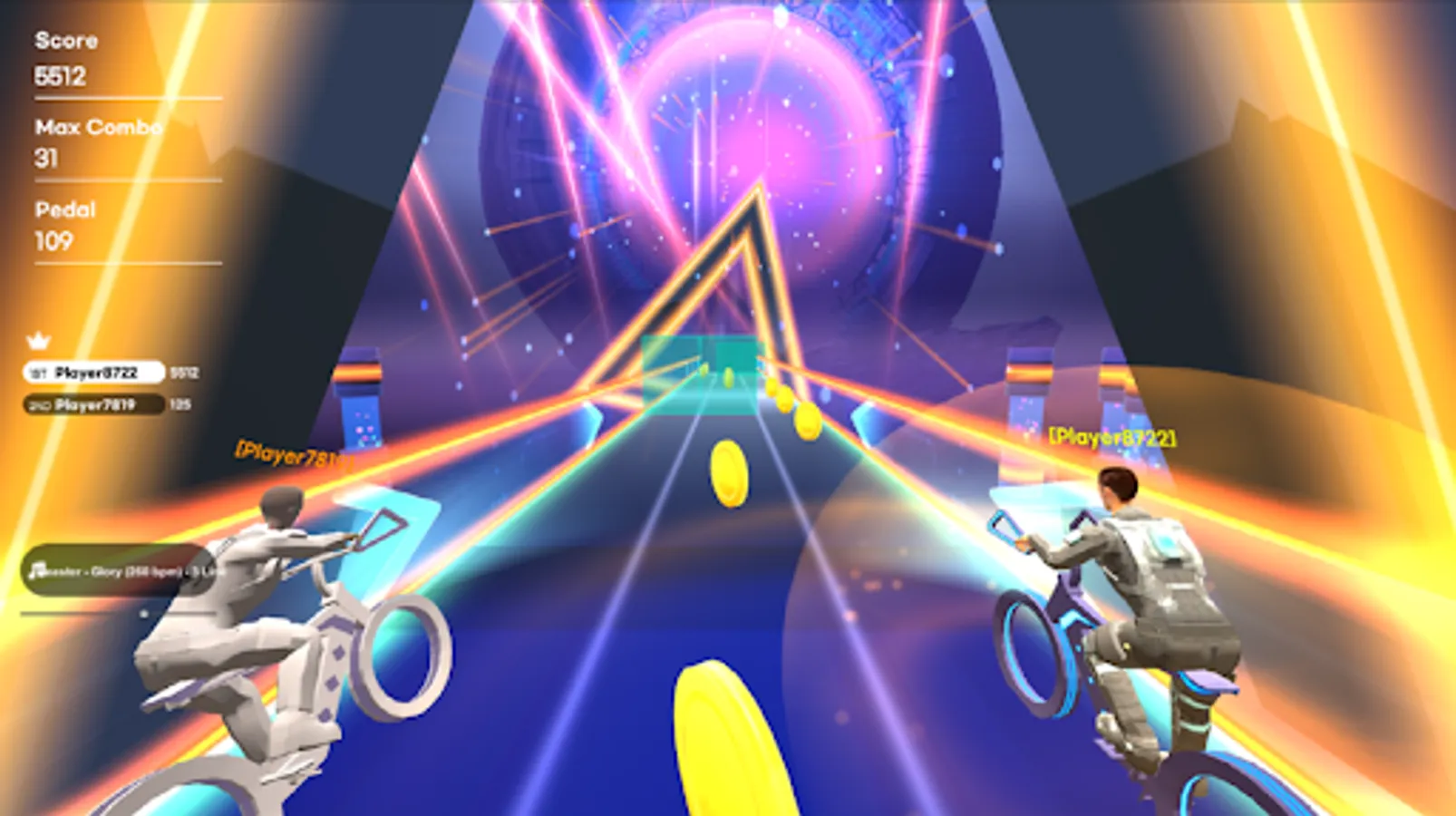 - It is a bike game that induces active movement by motivating the game using music. By moving the rails by turning the simulator, key notes are acquired, and the pedal is quickly pressed in the bonus rush section that comes out by passing the wall pattern that appears in each section. It is a rhythm dance game in which you compete to get a score by stepping on it and run quickly through a limited section.