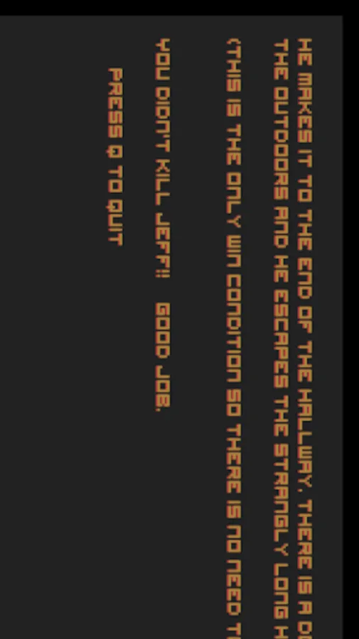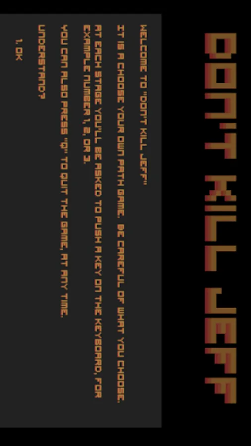 This game is a Text adventure game. Which provides you (the player) a few options for how to make Jeff react to certain situations. The goal is to get Jeff out safely without killing him.