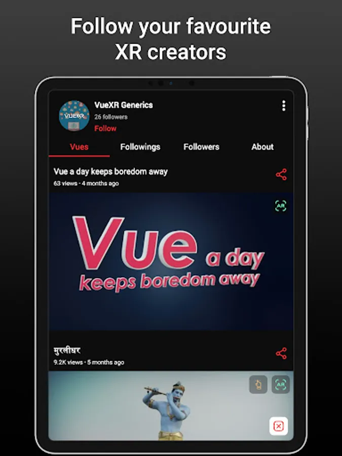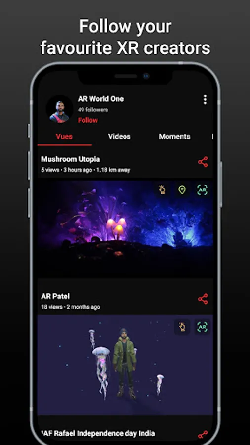 - Stay updated with the latest AR content, videos and photos uploaded by your favourite creator by following them.