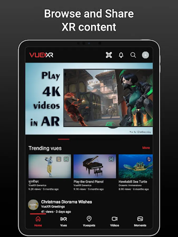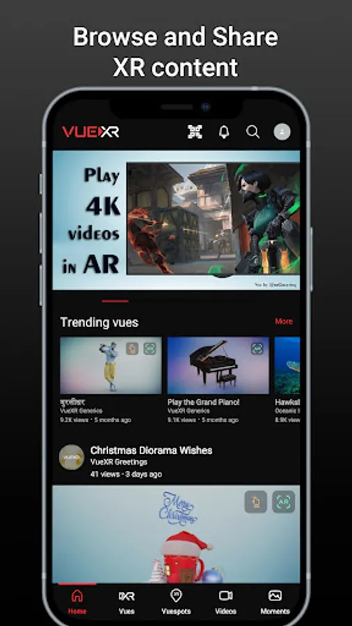 See Augmented Reality(AR) and Virtual Reality(VR) media content from creators around the world right in your Android device. Record videos and take photos while playing AR & VR media and share it to your Facebook, Instagram, Youtube, TikTok, Triller, Takatak and other social media handles. Get the latest official VueXR application for Android phones and tablets and explore creativity in XR from creators around the world.