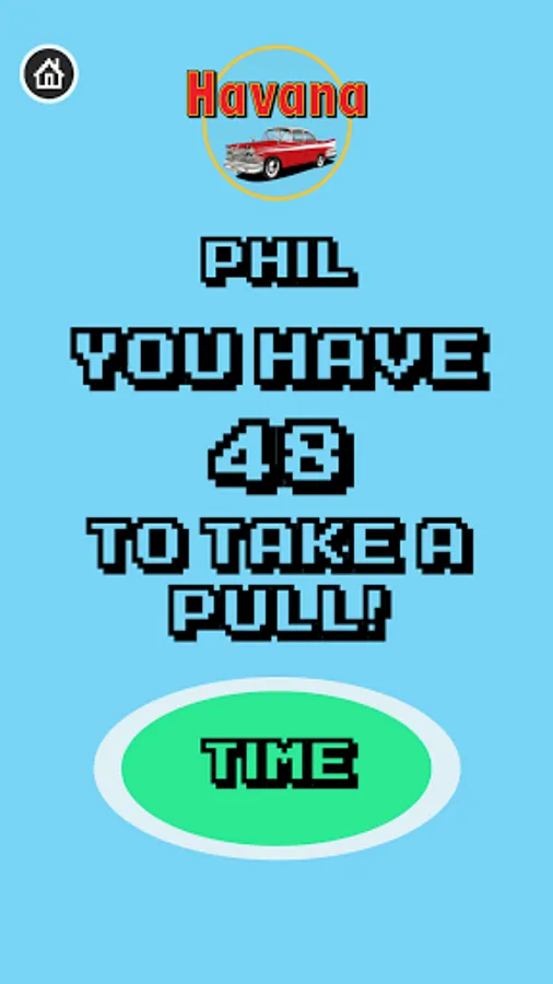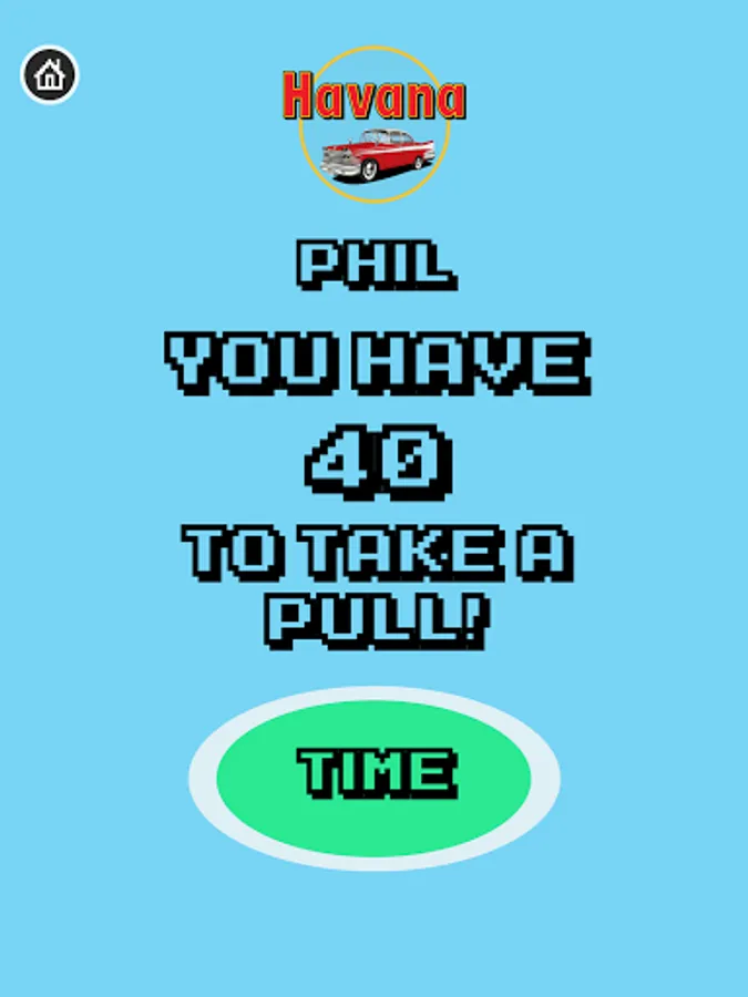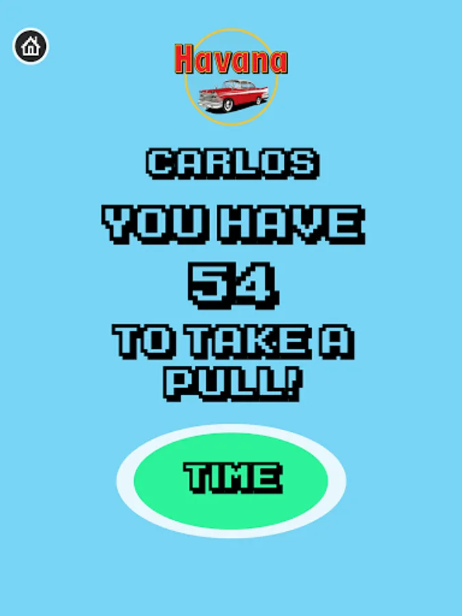 Havana is a game of persistence, skill, and intellect. This game can only be played with 2 players (or 2 teams). Players must go back and forth taking drinks before the clock on the screen expires. All players will have under 60 seconds to take a drink during a normal round. During the game, there are random speed rounds in which players must take drinks within a 15 second time period. The player that fails to press the timer before the clock expires, loses!