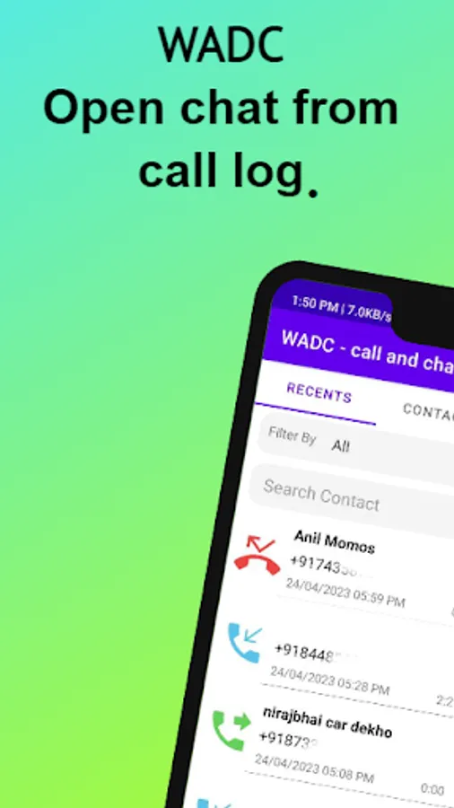 Our app comes allows you to initiate chats and calls with your contacts easily. Simply tap the "Hi" button in your call log to open WA chat with the recent number of call log, or use our built-in calling feature to initiate calls directly from the app.