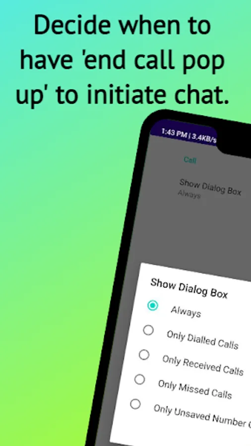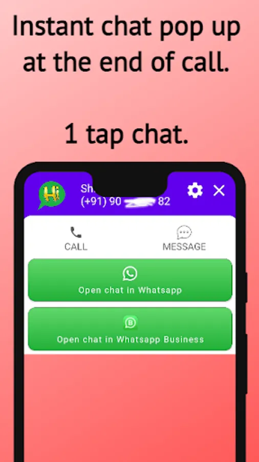-End call chat pop up to simply open chat with recent call.Just tap on button and simply you can open whatsapp or whatsapp business chat with that number.