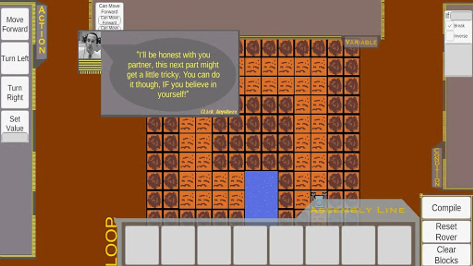 Danger Will Robotson is an education-based puzzle game that teaches the player to think like a programmer. In an effort to save a mars rover, the player must learn how to relay commands that will bring them home while avoiding dangerous terrain.
