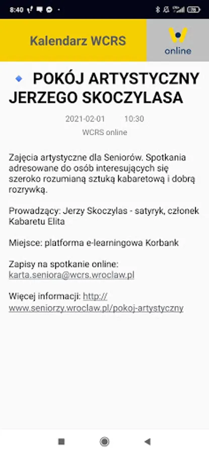 The application contains information on dates, times and a full description of events organized by the Wrocław Center for Social Development.