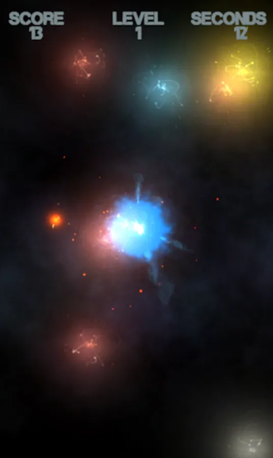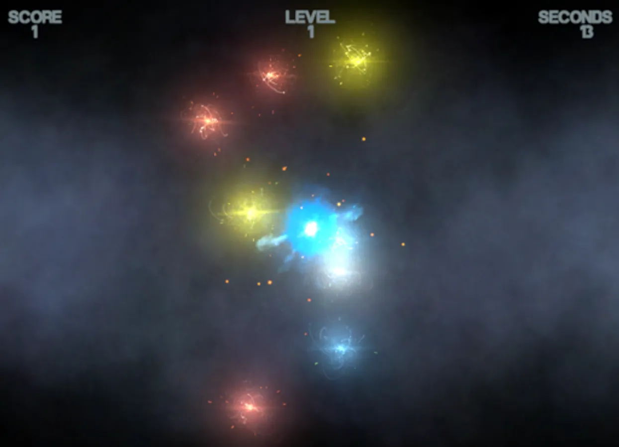 Destroy the particles before they disappear. Destroy the red particles in the game to obtain more game time. Yellow and green particles could up your score but also provide for more game time. Destroying blue particles however reduce the game time. So depending on your reflexes and reactionspeed the game could potentially last forever.