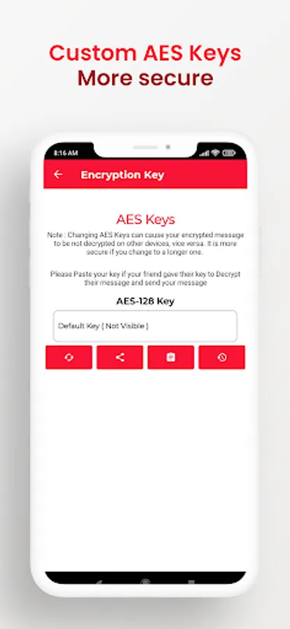 Secret Message encrypts and decrypts messages using a very strong default key and it uses 128-bit AES method. No one can hack it and see your messages.