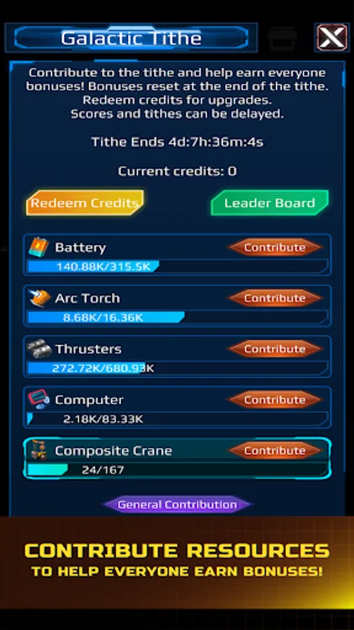 Contribute resources to the Galactic Tithe and help all players earn bonuses! Earn credits for your contributions and spend those on powerful upgrades, or exchange credits for even more resources!