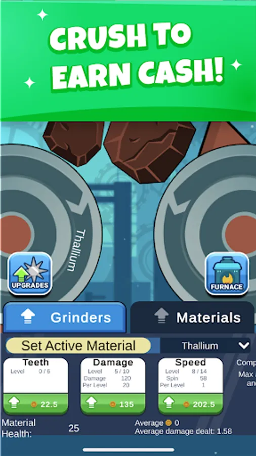 Spend the materials you grind up in the furnace to unlock the power of your grinders. Upgrade your grinders from the softest material all the way to diamond. You'll start weak but grow powerful in this incremental game! Become a crushing simulator tycoon!