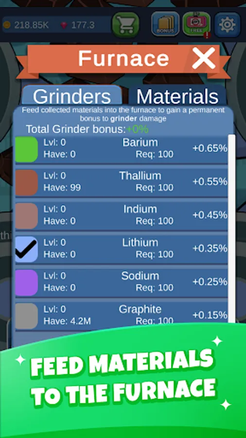 Unlock & Upgrade - Upgrade both your materials and your grinder machines to earn more