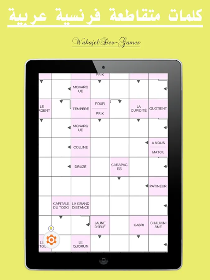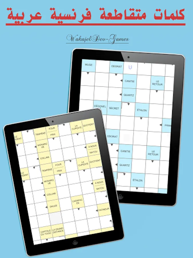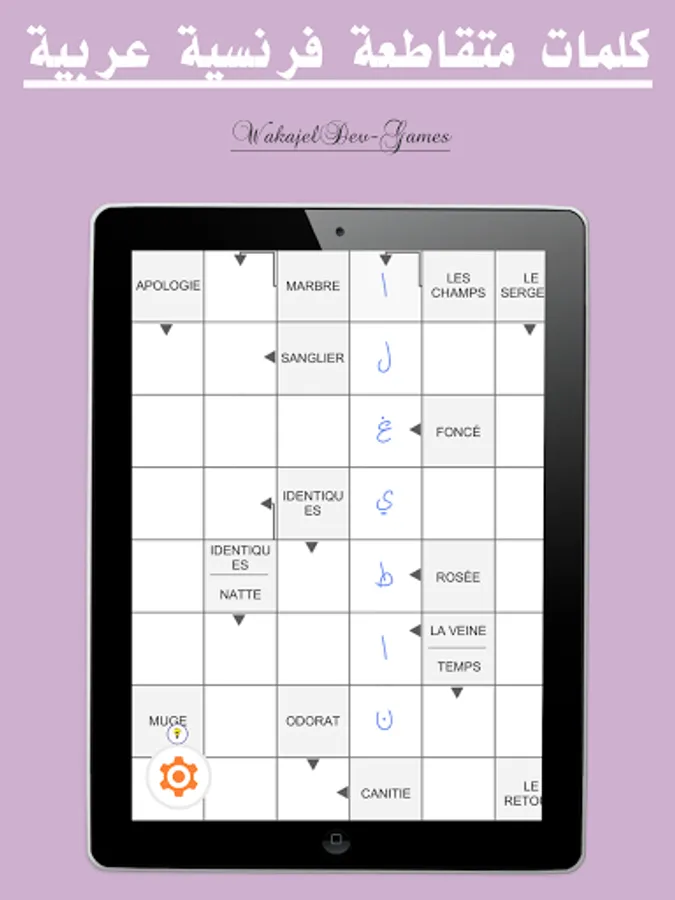 تعتبر الكلمات المتقاطعة او الكلمات المسهمة من بين اشهر الالعاب افادة و هي عبارة عن اسئلة متنوعة و الغاز.لكن في لعبتنا هذه نقدم لك مفردات في اللغة الفرنسية و المطلوب منك كتابة المرادفات المناسبة لها باللغة العربية.