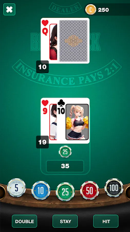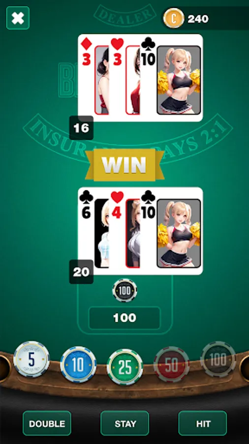 Sexy Blackjack Girls is easy to play! Place a bet, and you'll receive 2 cards. Picture cards are worth 10 points and Aces are worth either 1 or 10. "Hit" for another card, and get your score as close to 21 as you can without going bust.