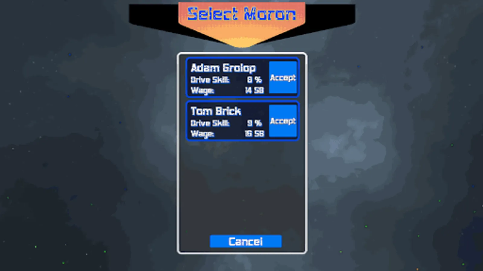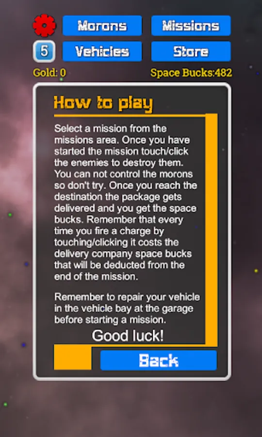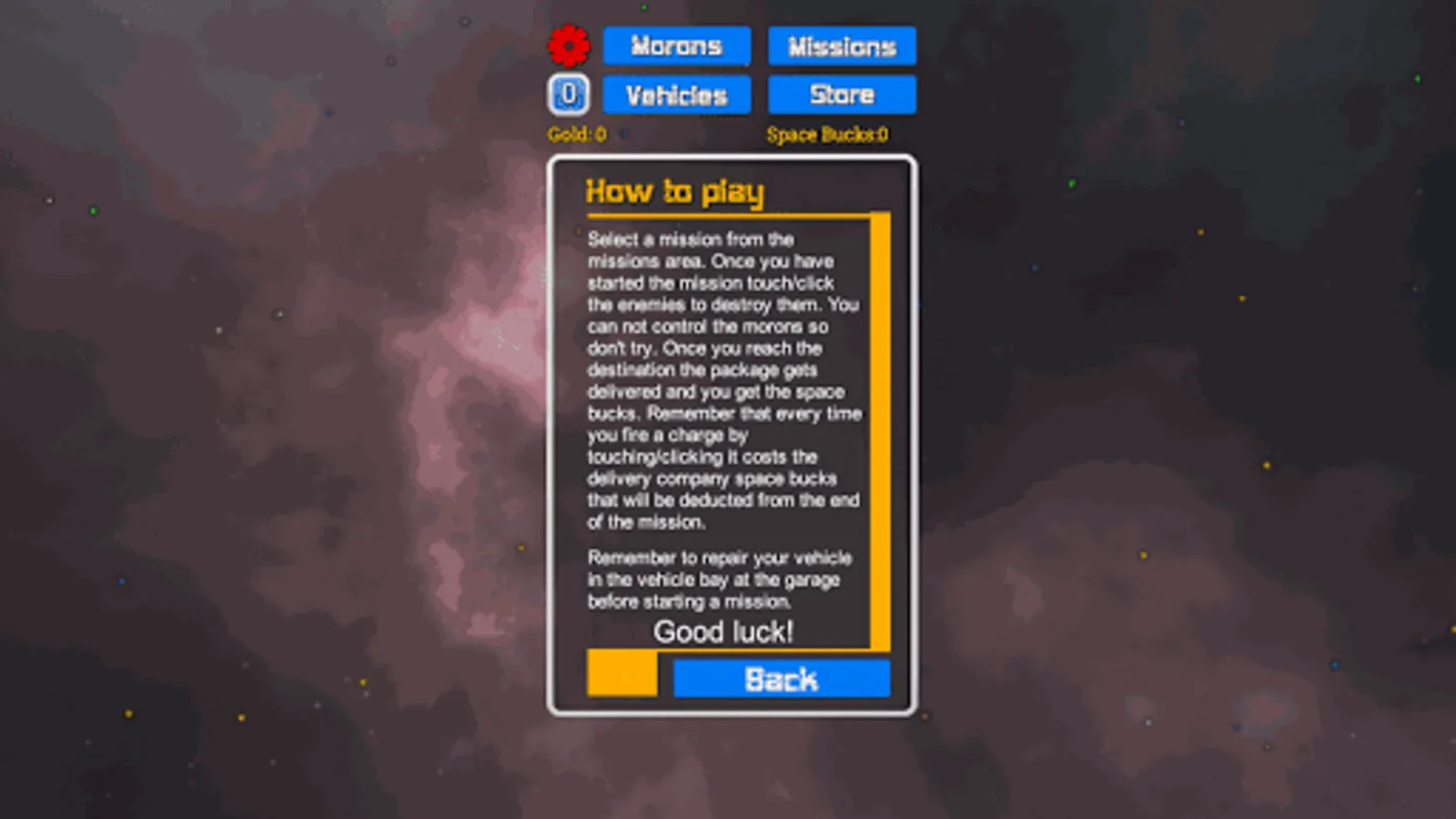 Enjoy the frustration of running a space delivery company. In this simple, time wasting game you will have to manage, train, and protect the morons you hire. Unlock up to fourteen vehicles for your morons to use. Hire additional morons. All expenses have been spared except on the music...