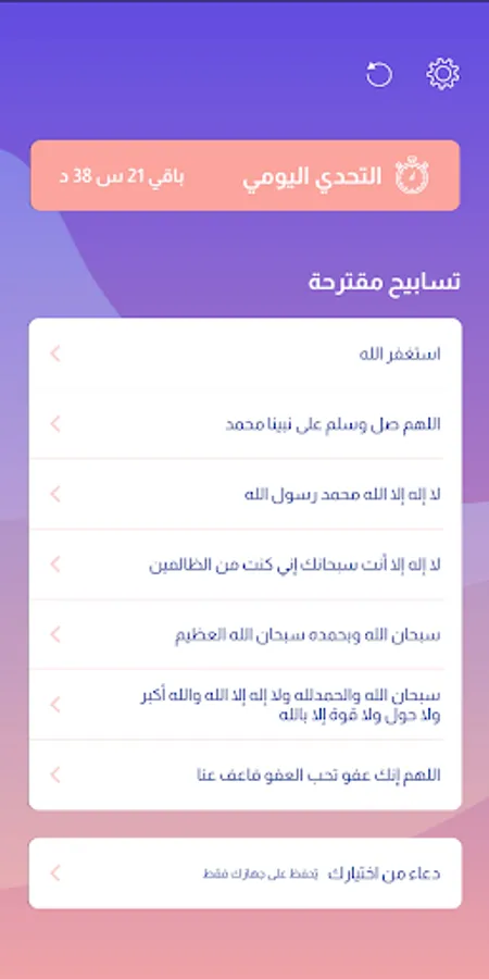 Every day you can challenge yourself and break the census through the "daily challenge". This challenge is a supplication, a male or a Quranic verse with a specific frequency and this is only for encouragement.